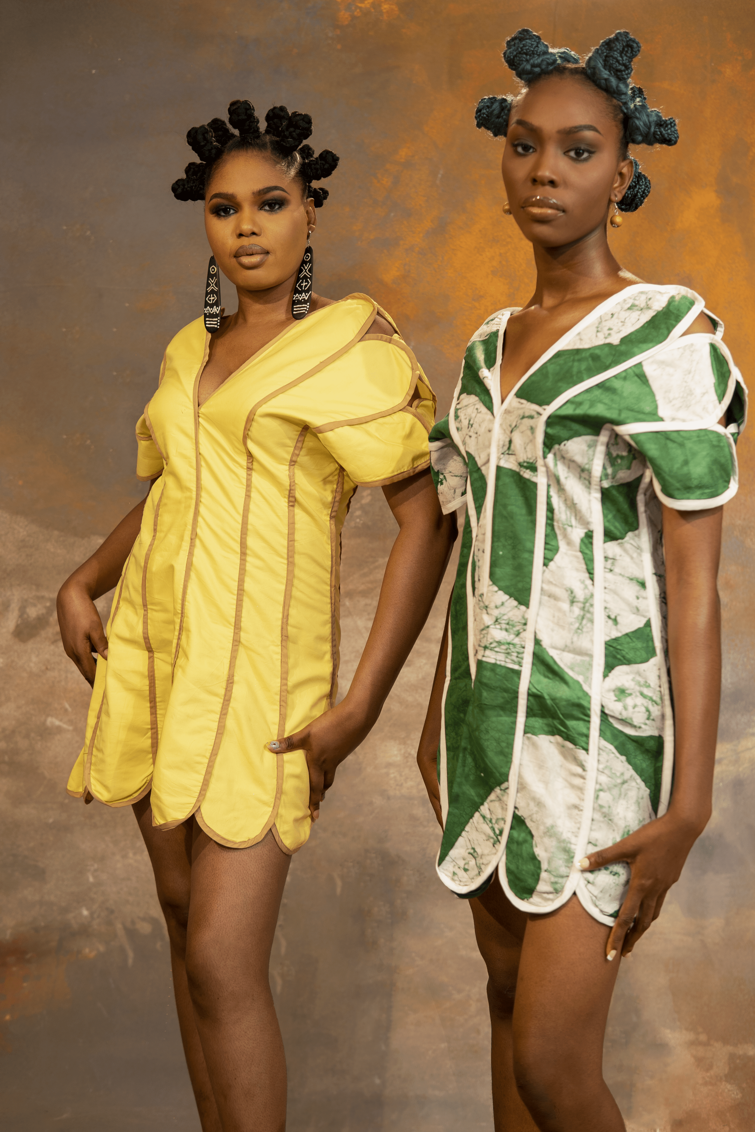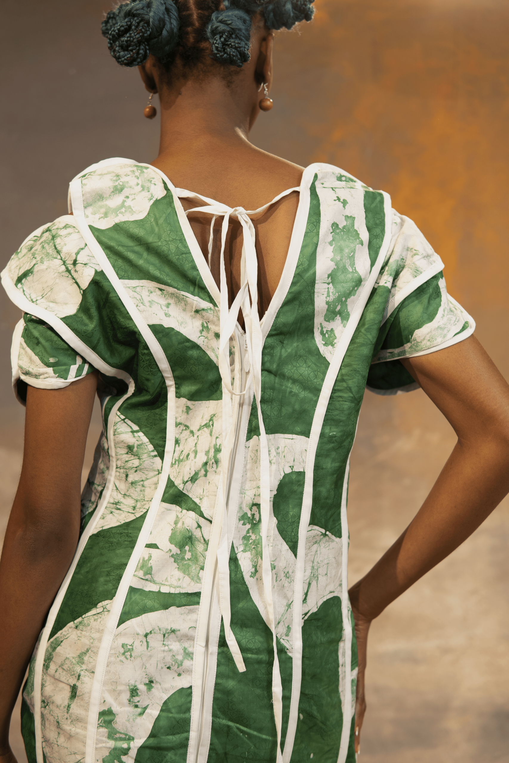 The VA-ETO Dress is a mini Adire dress designed with a unique angular short sleeve and a deep V-neckline. The back also features a V-cut with a tie detail and a zipper for easy wear. Its design includes curved fabric inserts that add shape and dimension, giving the dress a structured and stylish look.