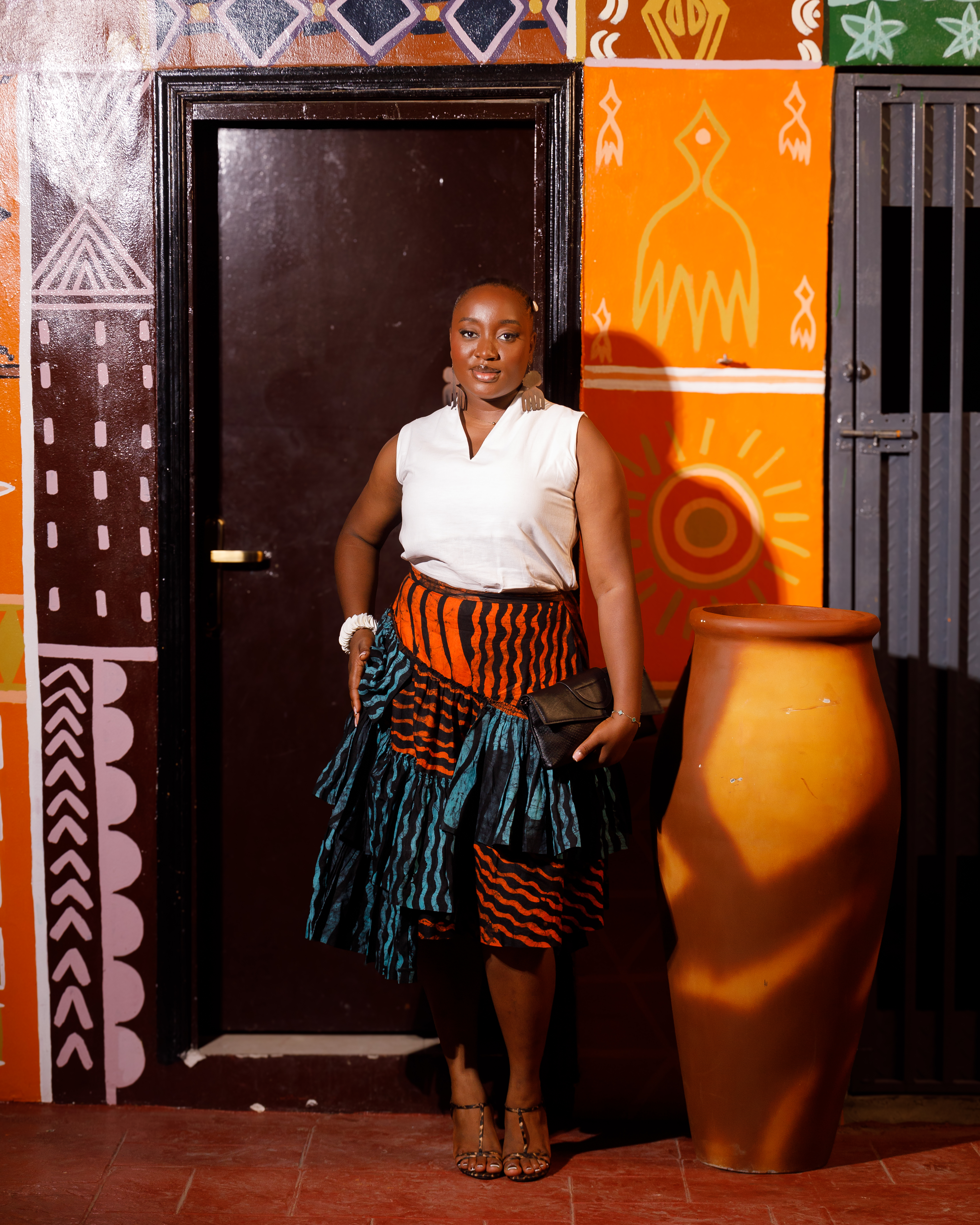 The Bold Essence Dress is a flowy Adire long dress with eye-catching patterns, a stunning open back, and two side pockets for effortless style and comfort.