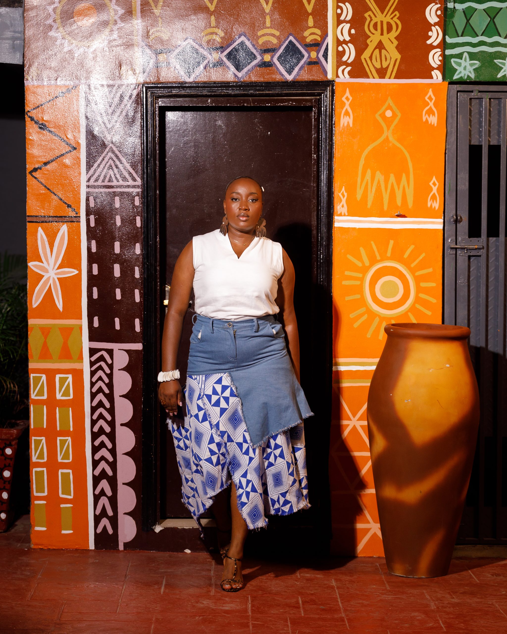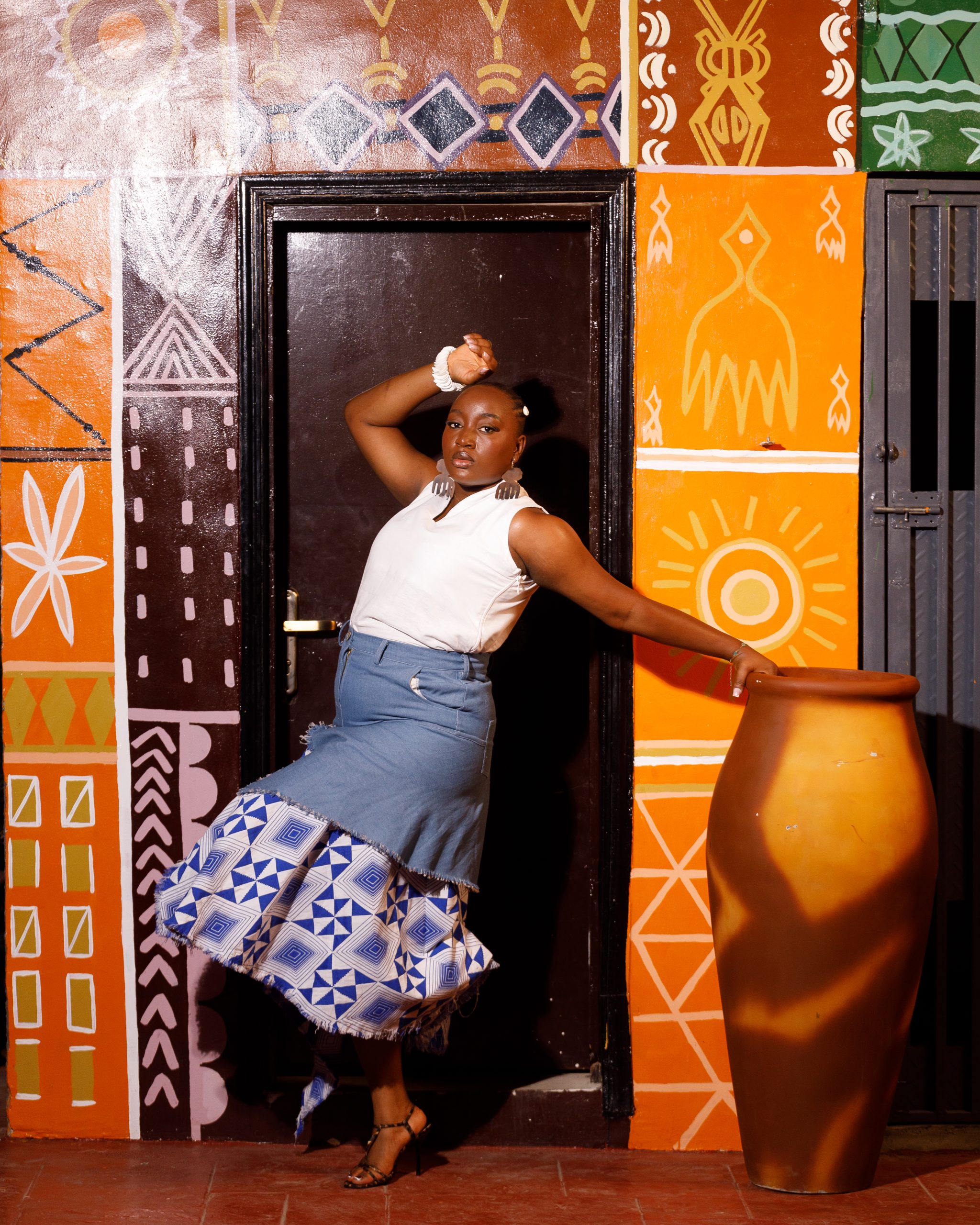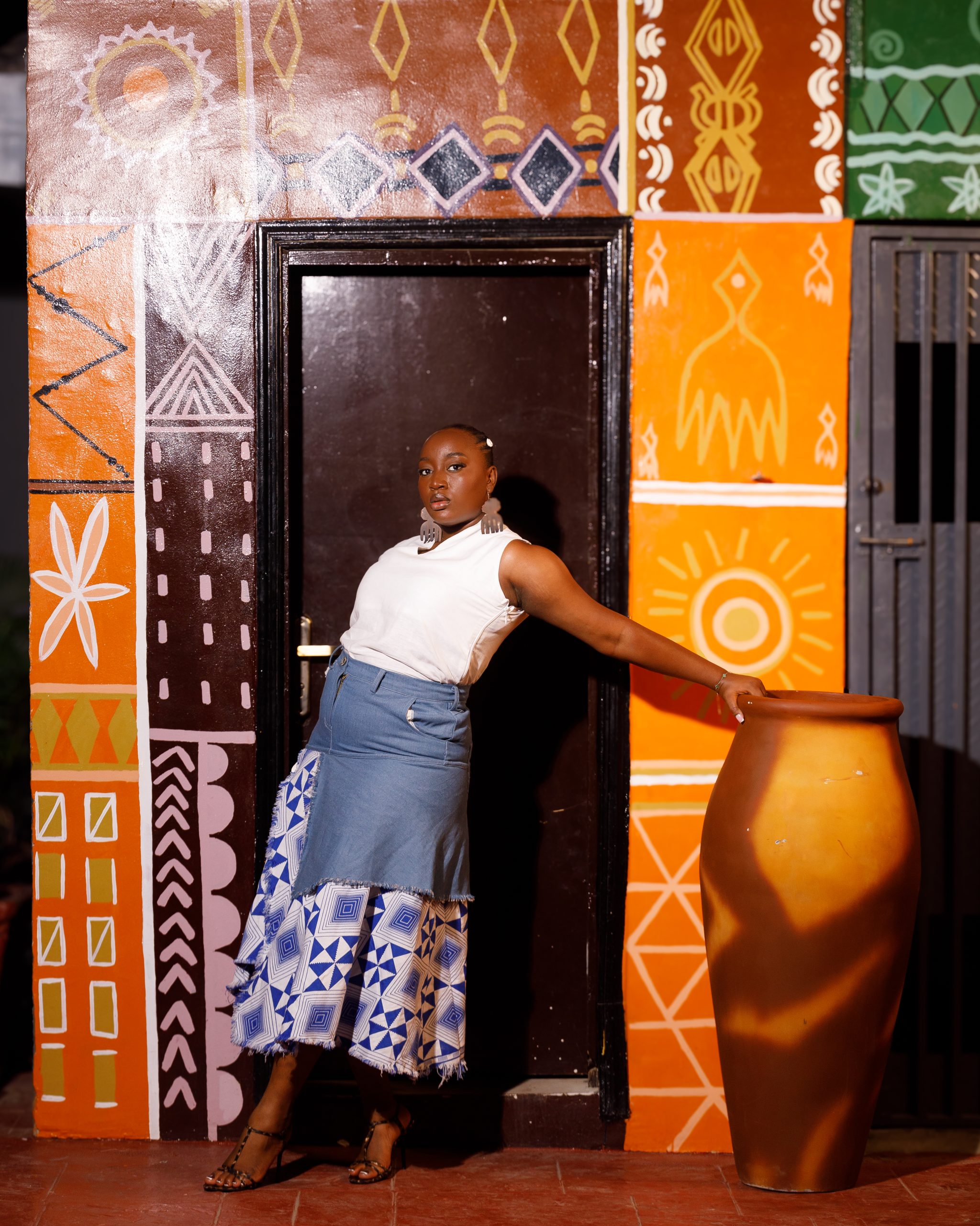 This is a flared skirt with an asymmetric drop design, made from a mix of Akwete fabric and denim. It features patch detailing, two side pockets, and two back pockets. It has belt loops, a zipper, and a button fastening. The skirt is free-flowing and easy to wear, and can be styled with any top of your choice.