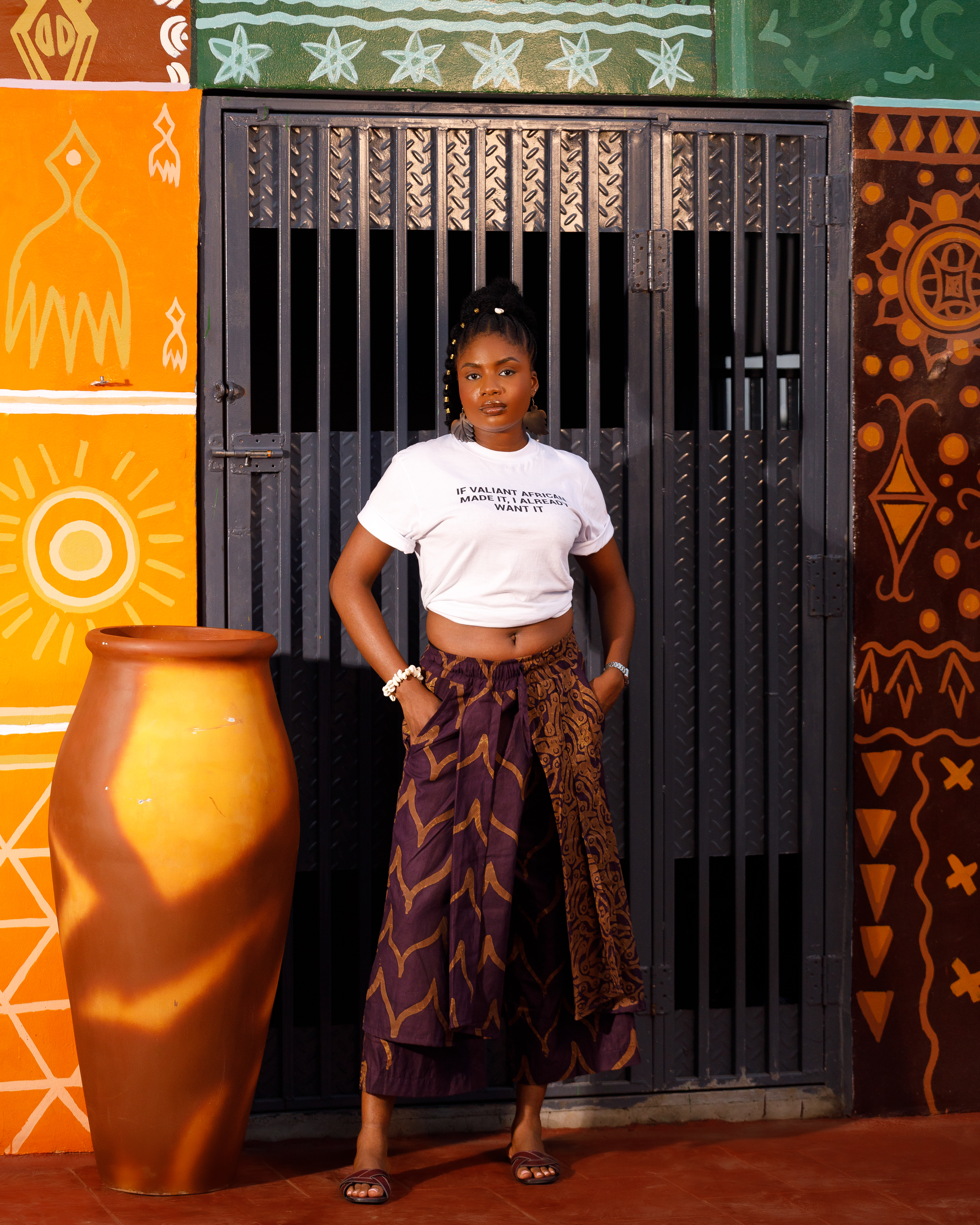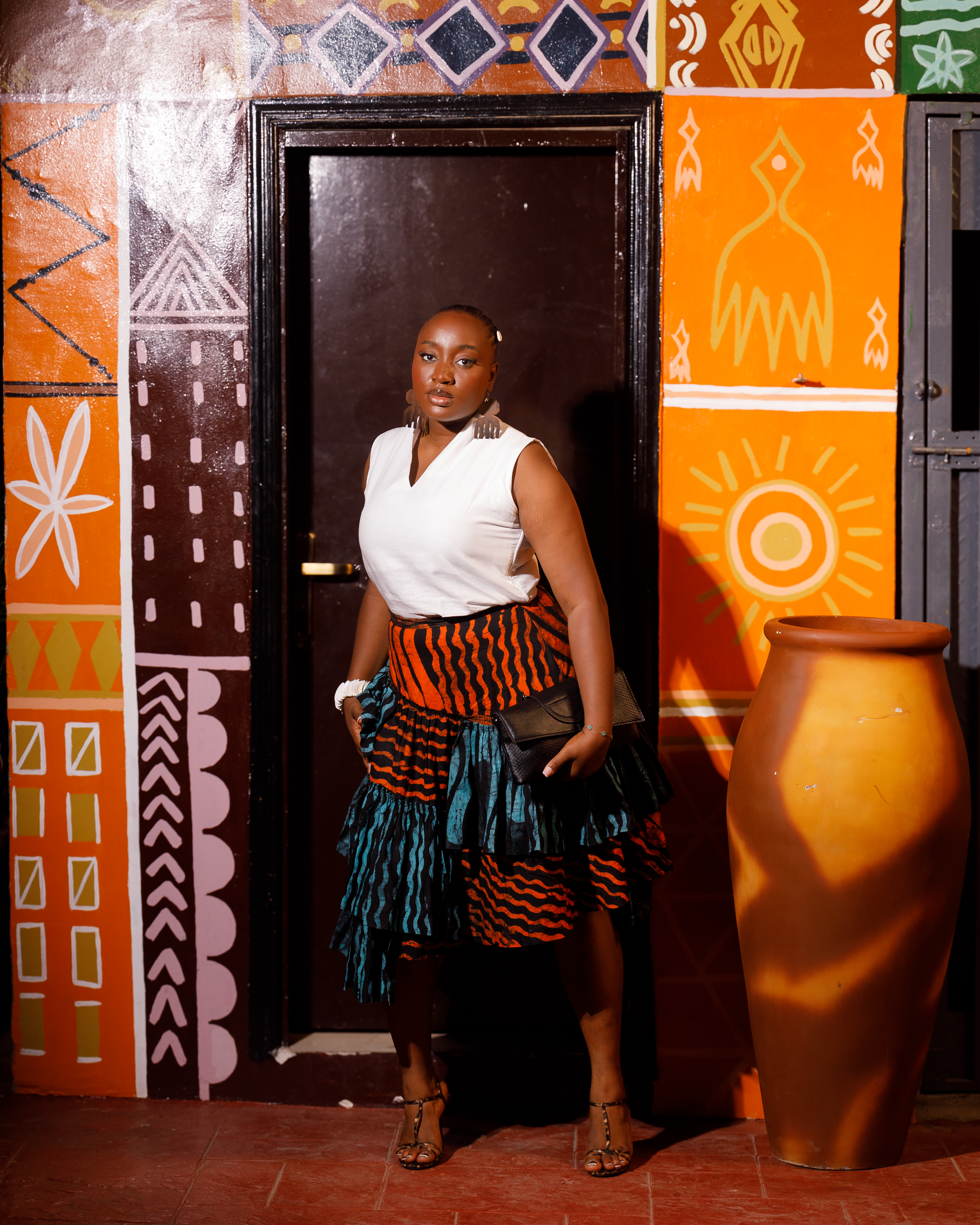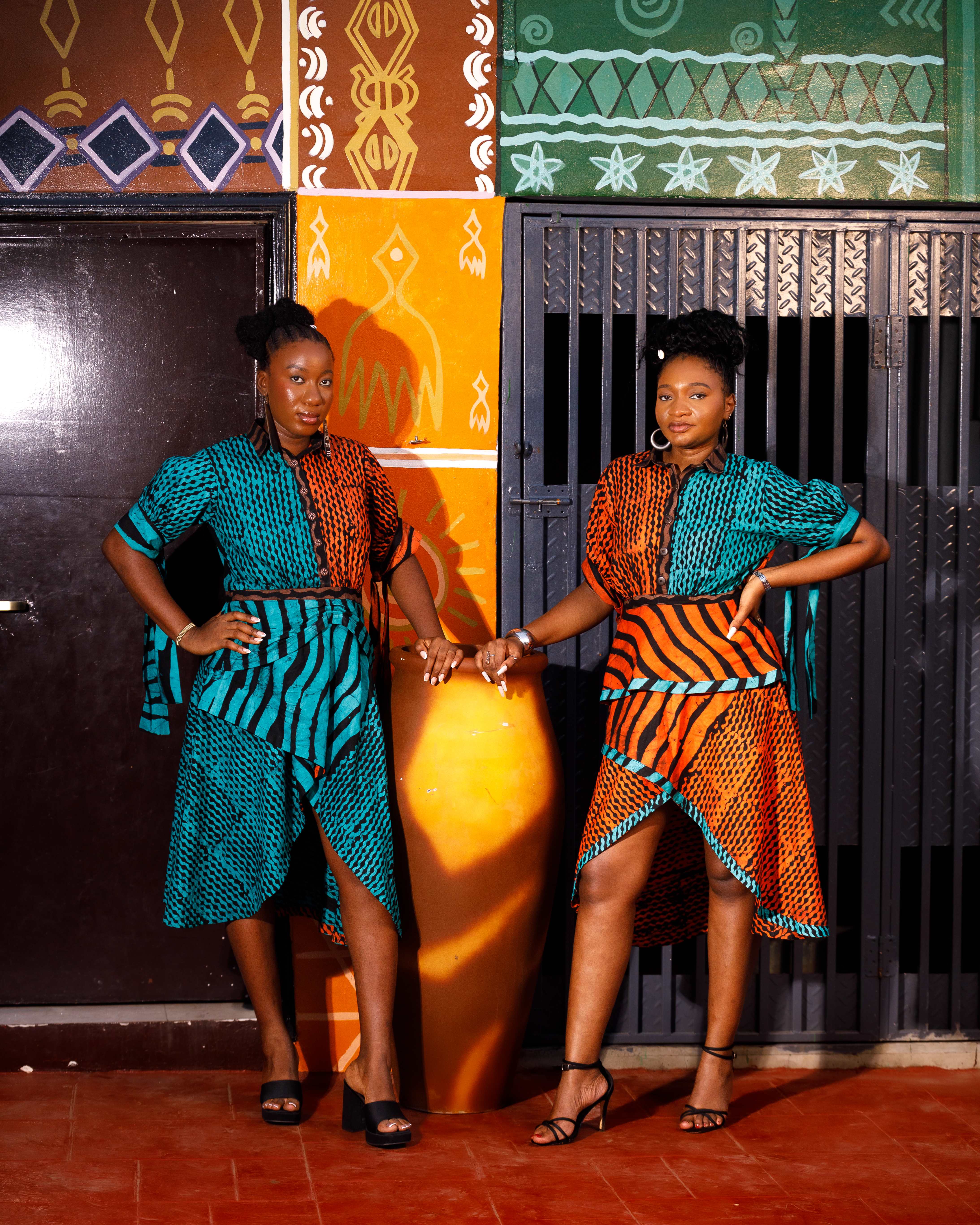 A very flared skirt made from a mix of two different Adire fabrics and colors. It is designed with multiple layers of flair, giving it extra volume, fullness, and a dramatic flow. The skirt moves beautifully with every step, creating a bold, elegant, and statement-making.