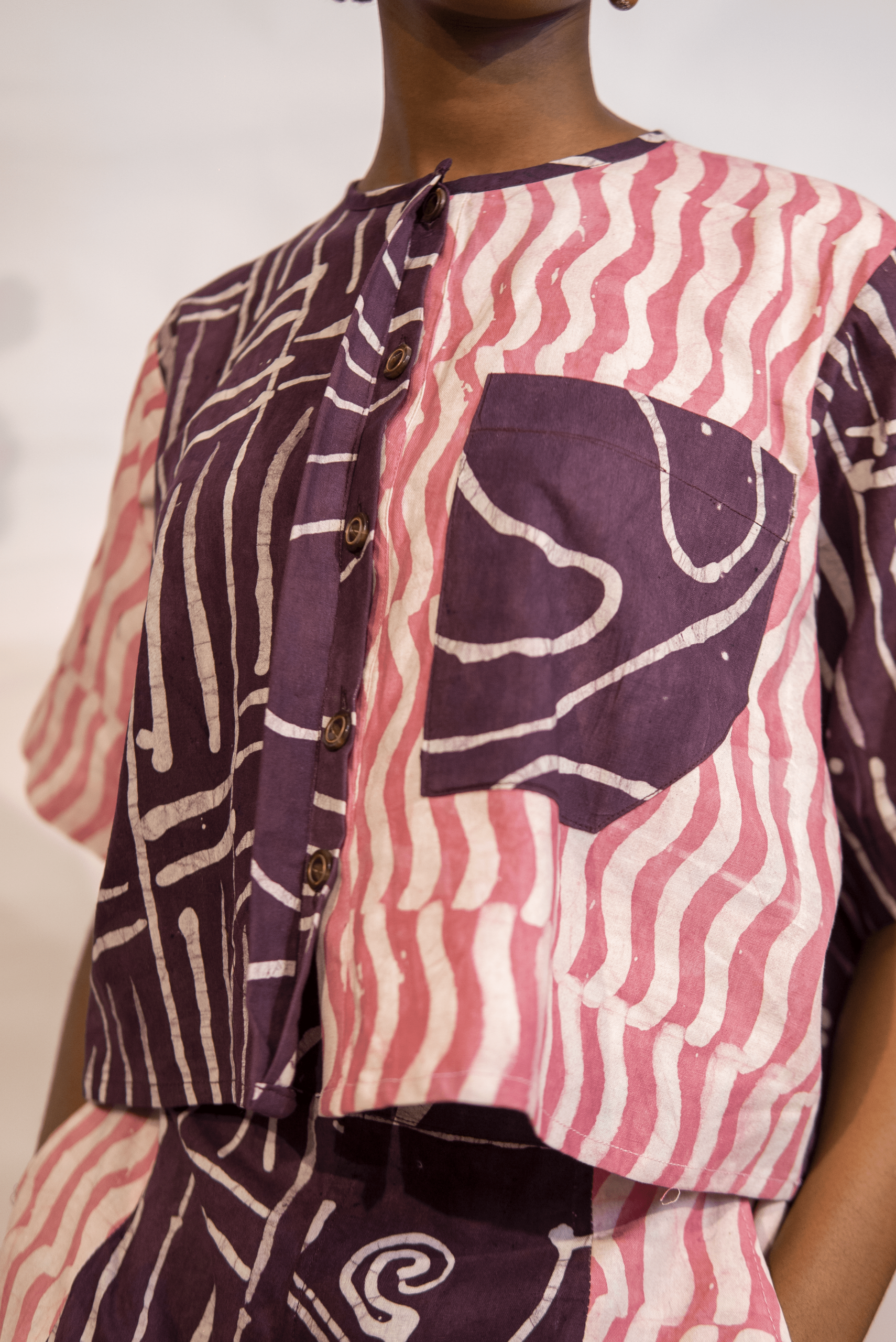 The VA AJOKE Set is a unique mix of two distinct adire. It features a collarless neckline, button-down cropped shirt, with short sleeved and chest pocket with contrasting fabric placement. This is combined with a high waist full band midi length pants , with deep side pockets.