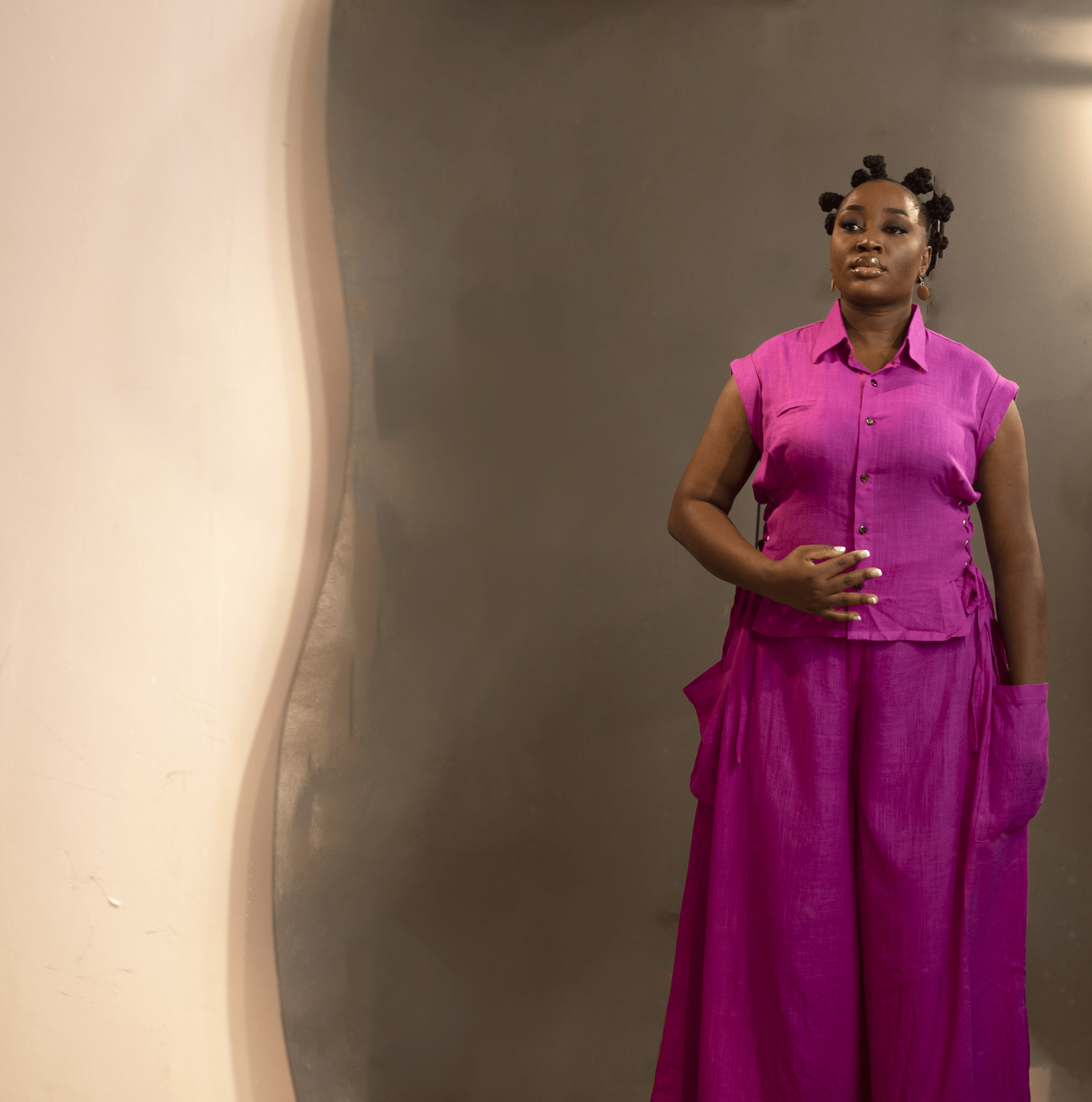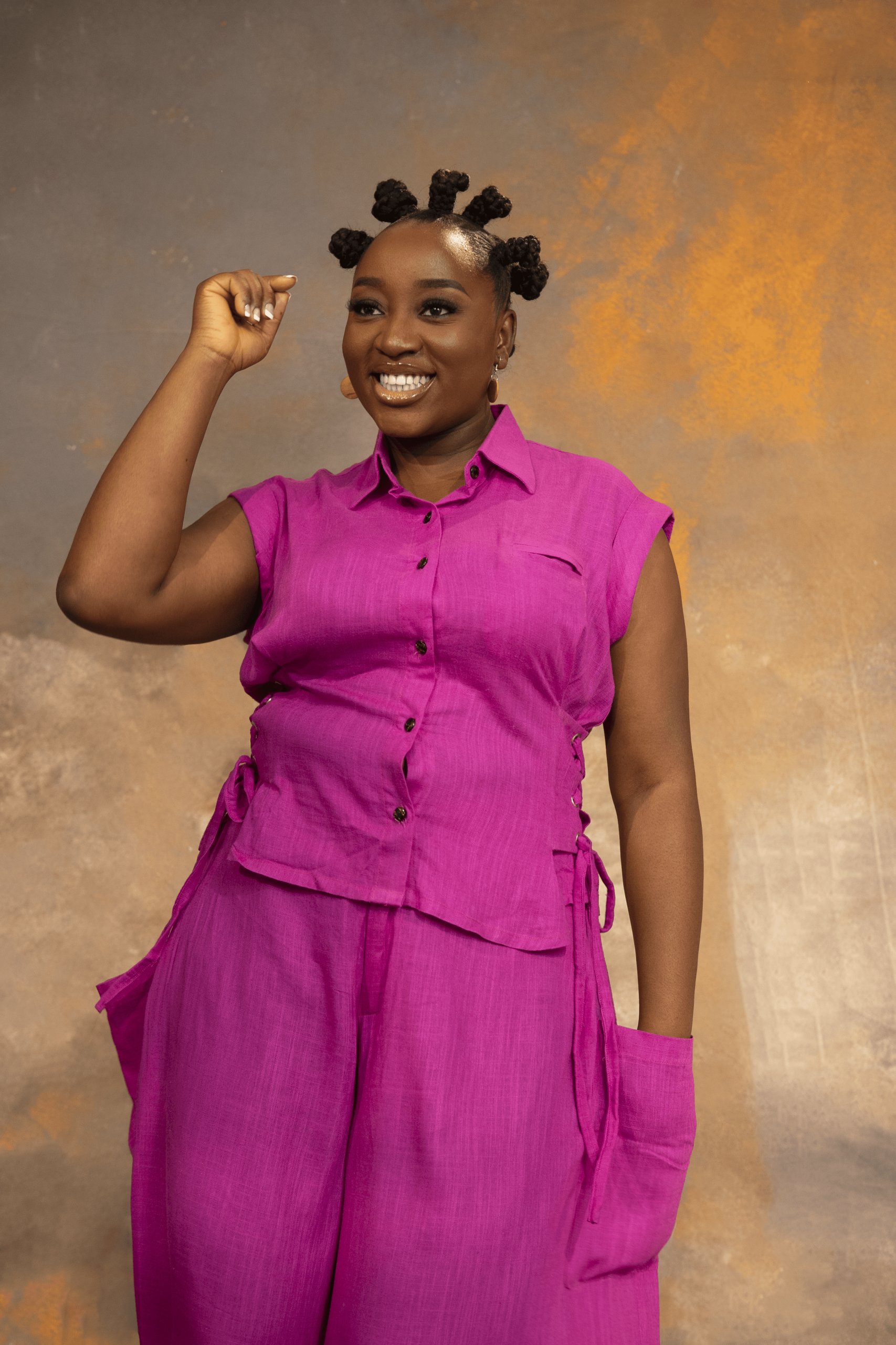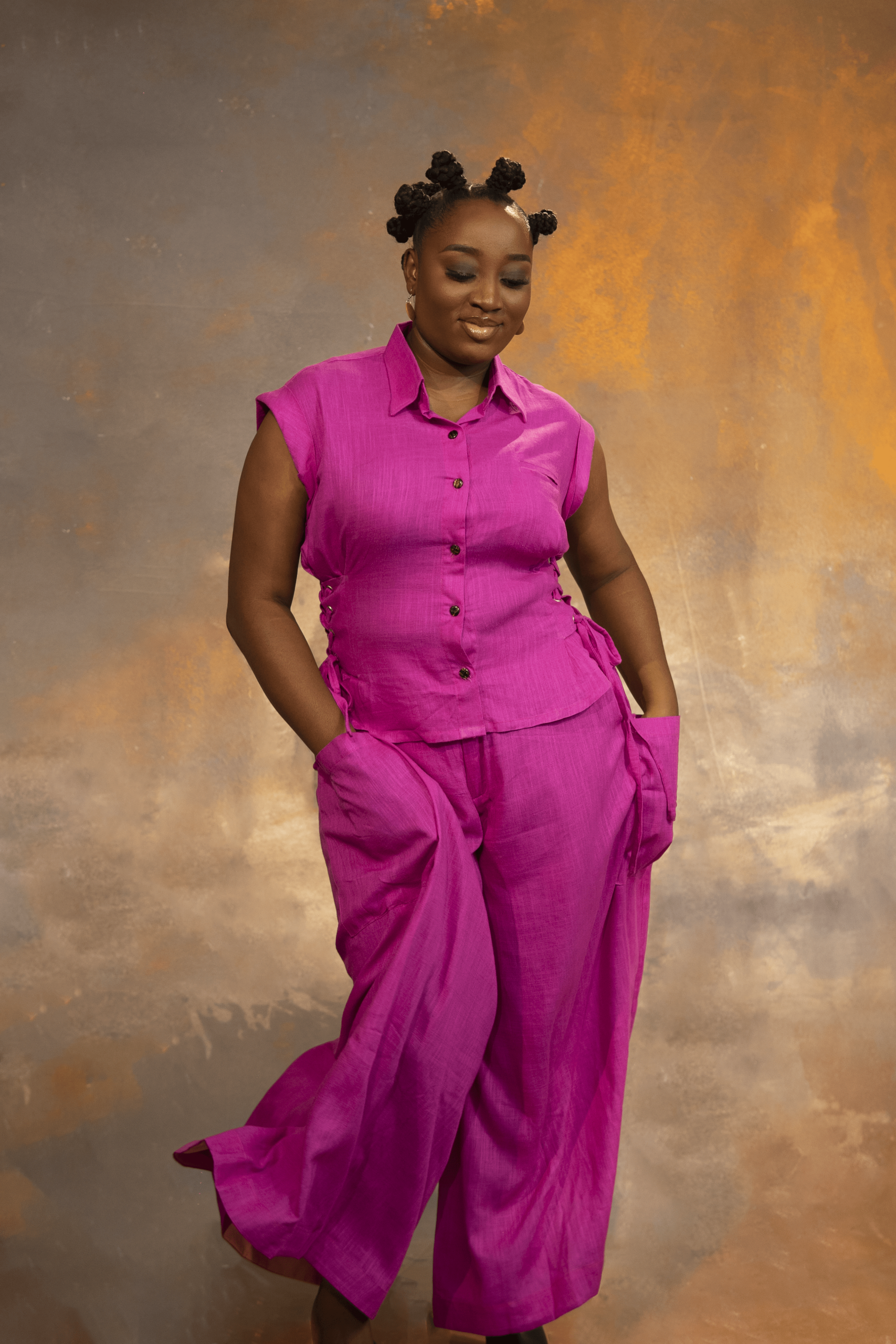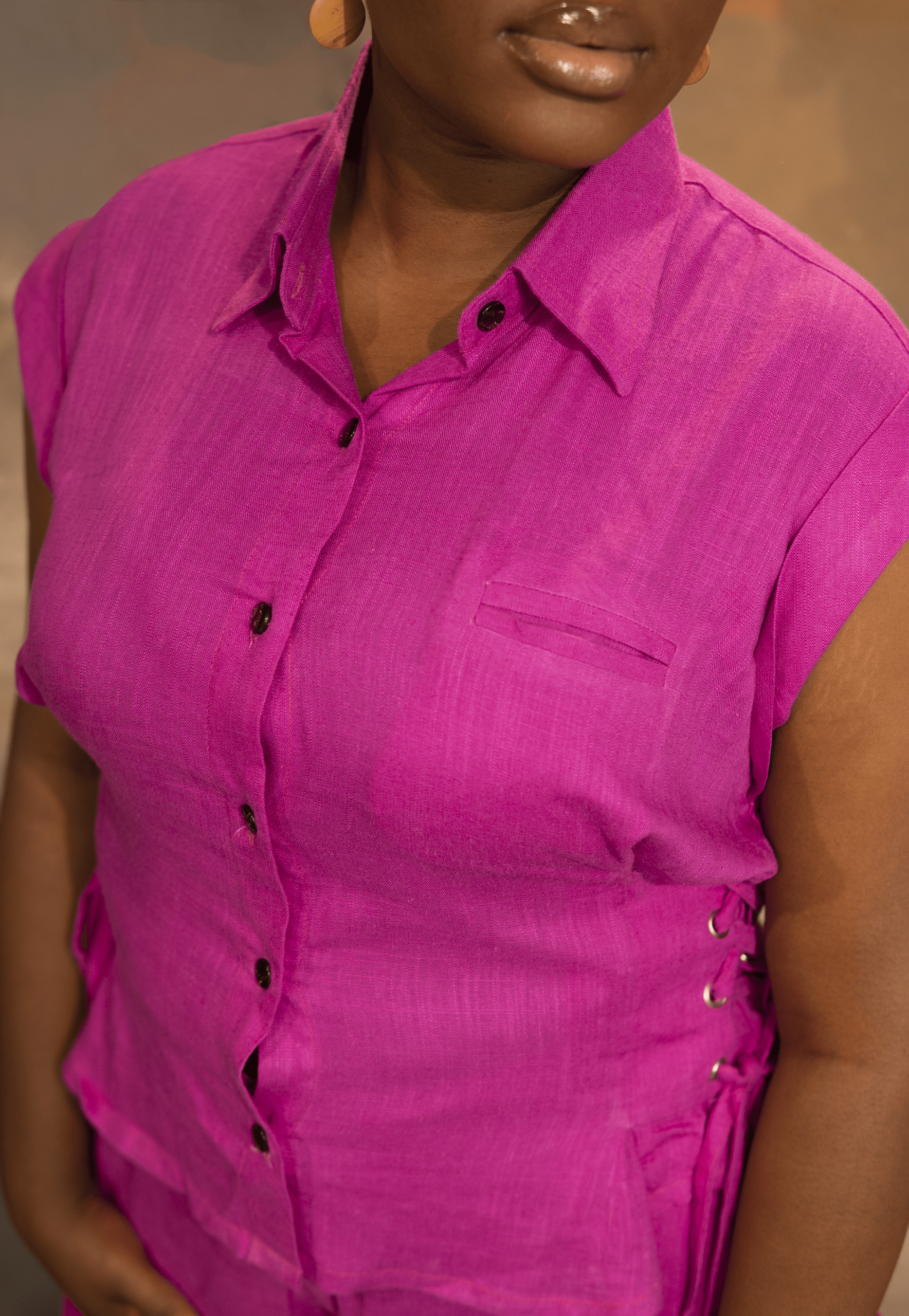 The VA-ANIKE Set is a chic Linen two-piece featuring a sleeveless button-down top with lace-up side details and flared pants with deep pockets. A bold mix of structure and elegance.