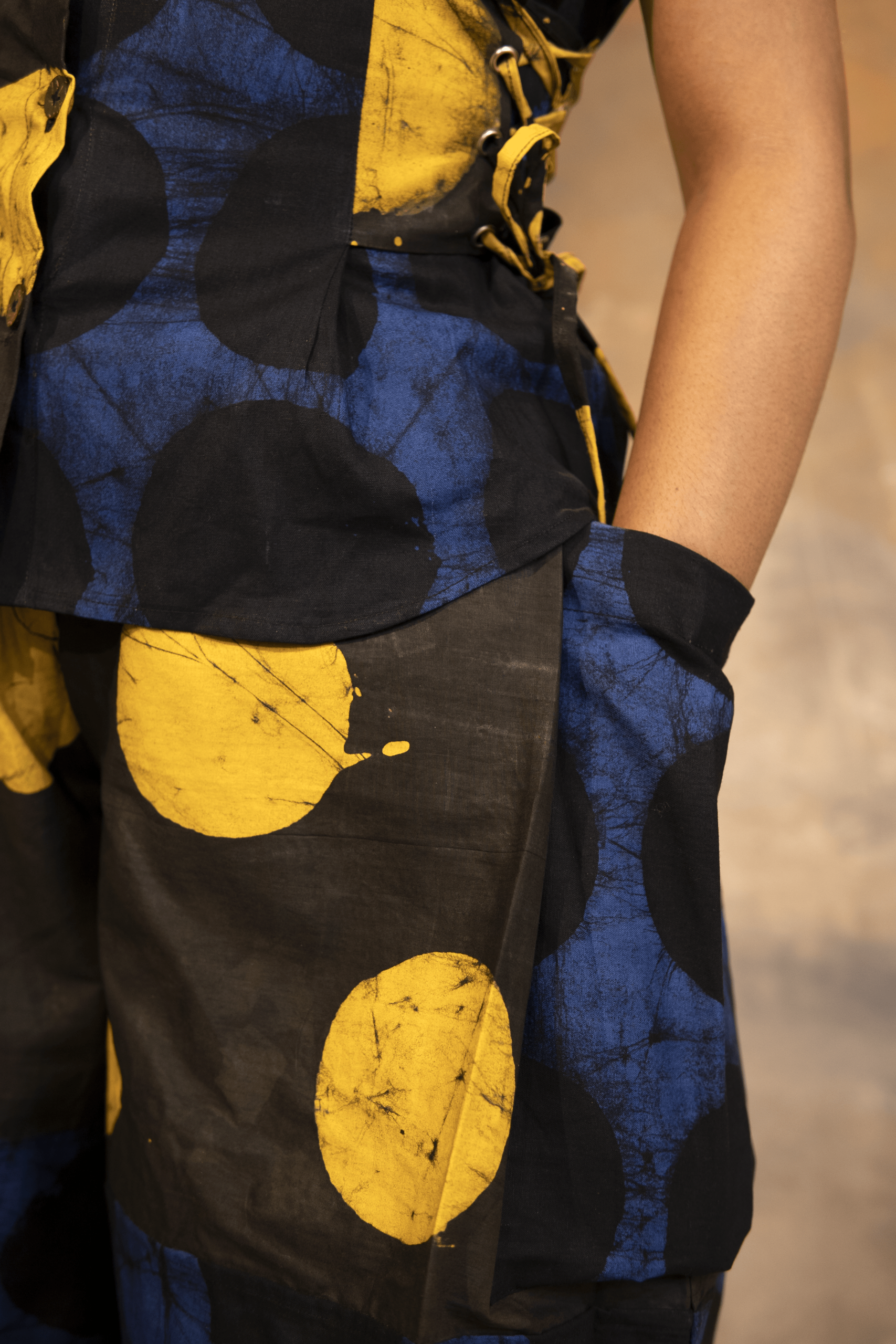 The VA-ANIKE Set  is a stylish two-piece made with mixed Adire fabrics. The sleeveless button-down shirt has a fitted waist, a structured bodice, and lace-up side details that highlight the waistline. It also features a mini chest pocket and turned-up sleeves for a chic touch. The matching pants come with a wide waistband, defined seams, and a dramatic flared shape, complete with deep angled side pockets at the hips. This set is both striking and elegant.