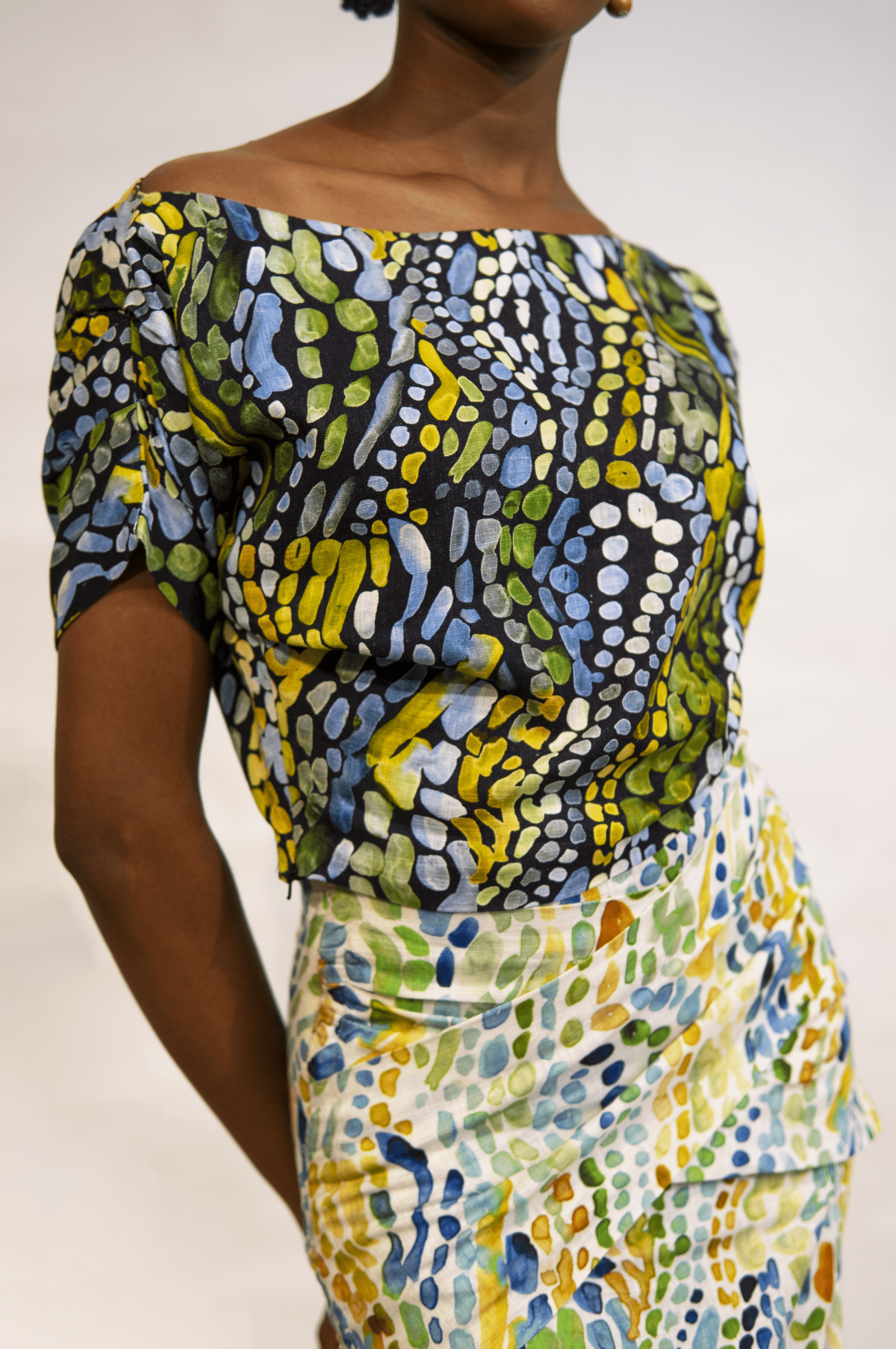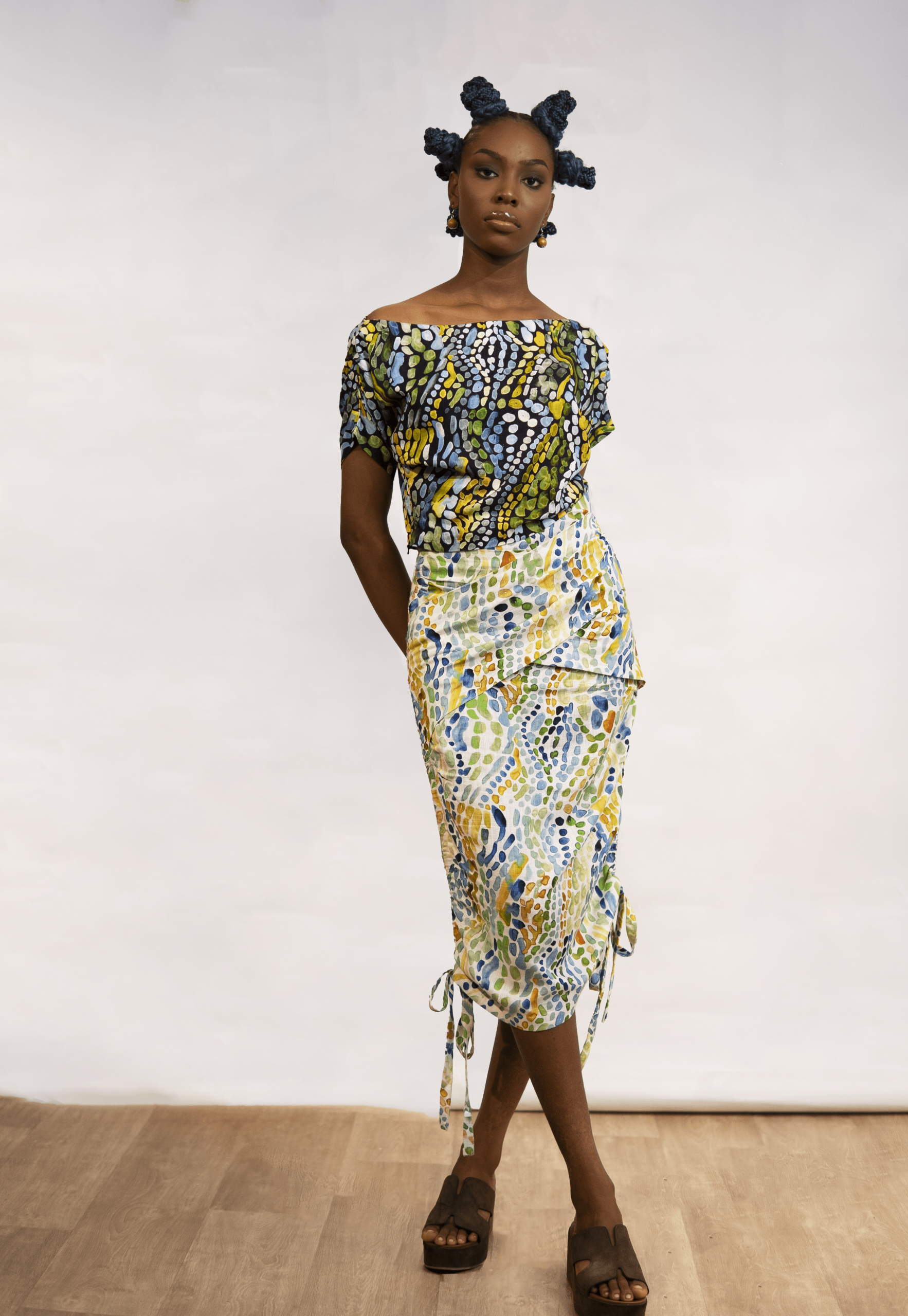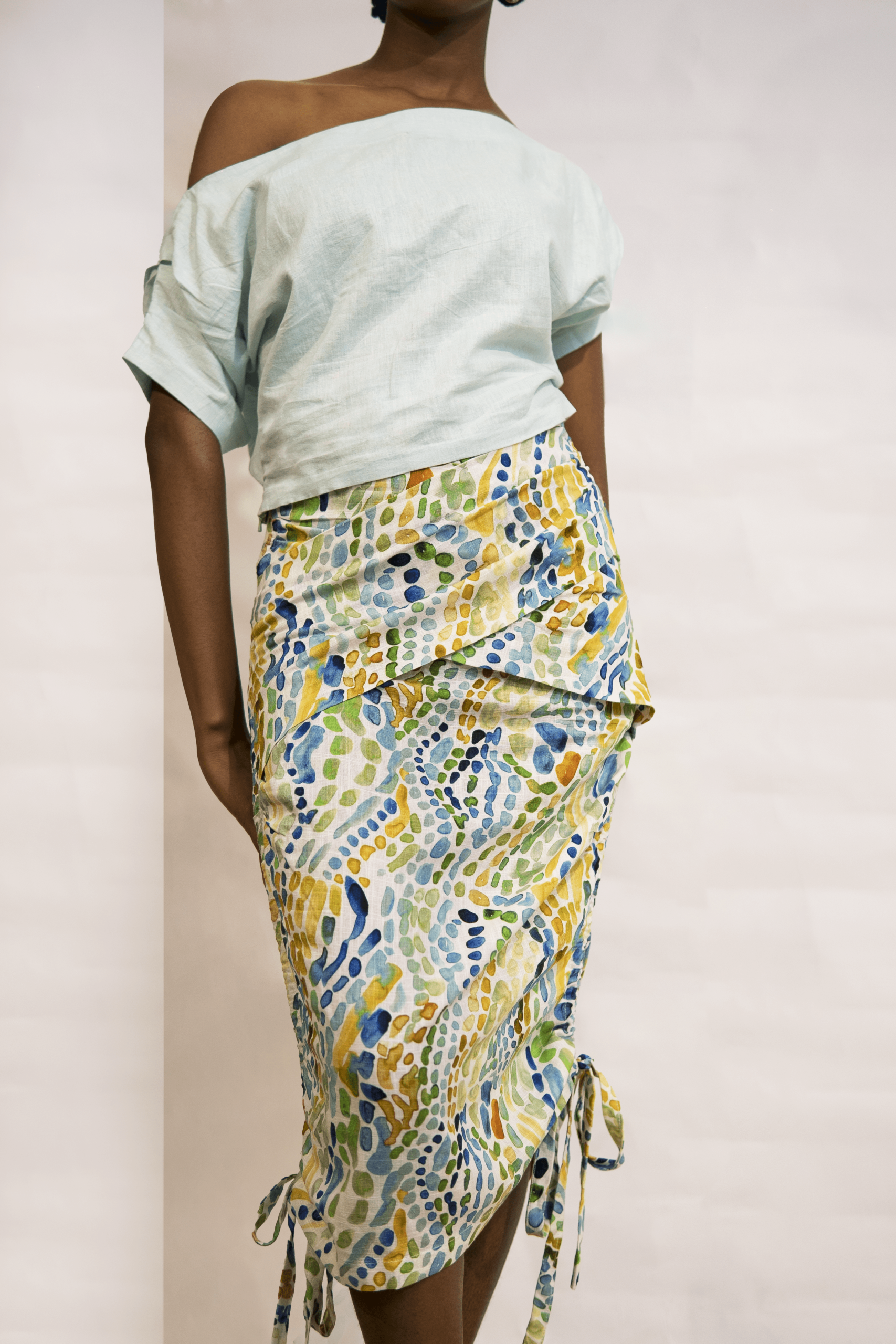 The VA-ARA Set is a plain and patterned linen two-piece featuring a relaxed off-shoulder blouse with wide neckline and side zipper, paired with a midi wrap-style skirt with adjustable drawstring for customizable ruching and length.
