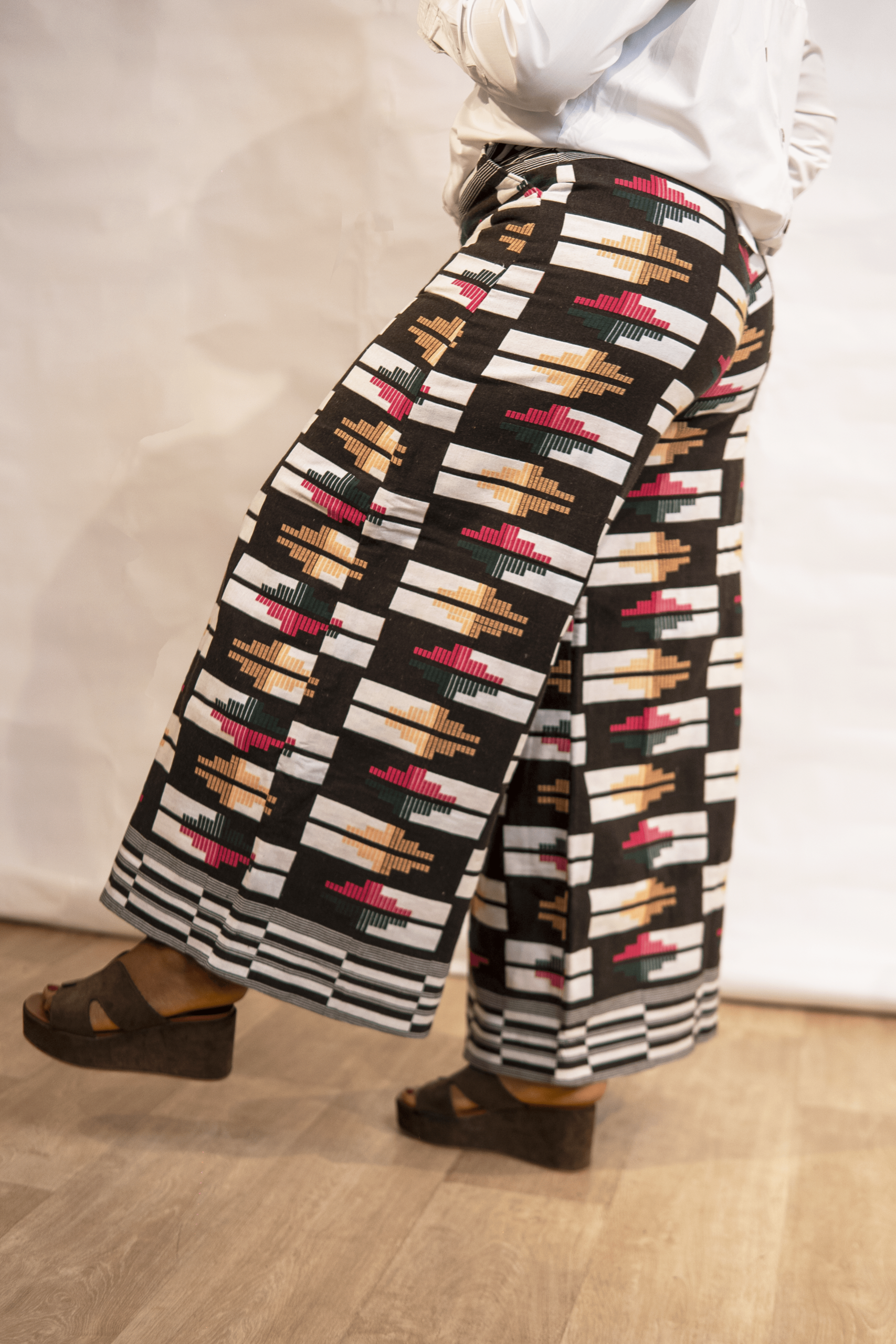 The VA-TRAD Set showcases Akwete-inspired wide-leg trousers with a structured high waist, banded detail, and deep side pockets. A bold fusion of tradition and modern style.