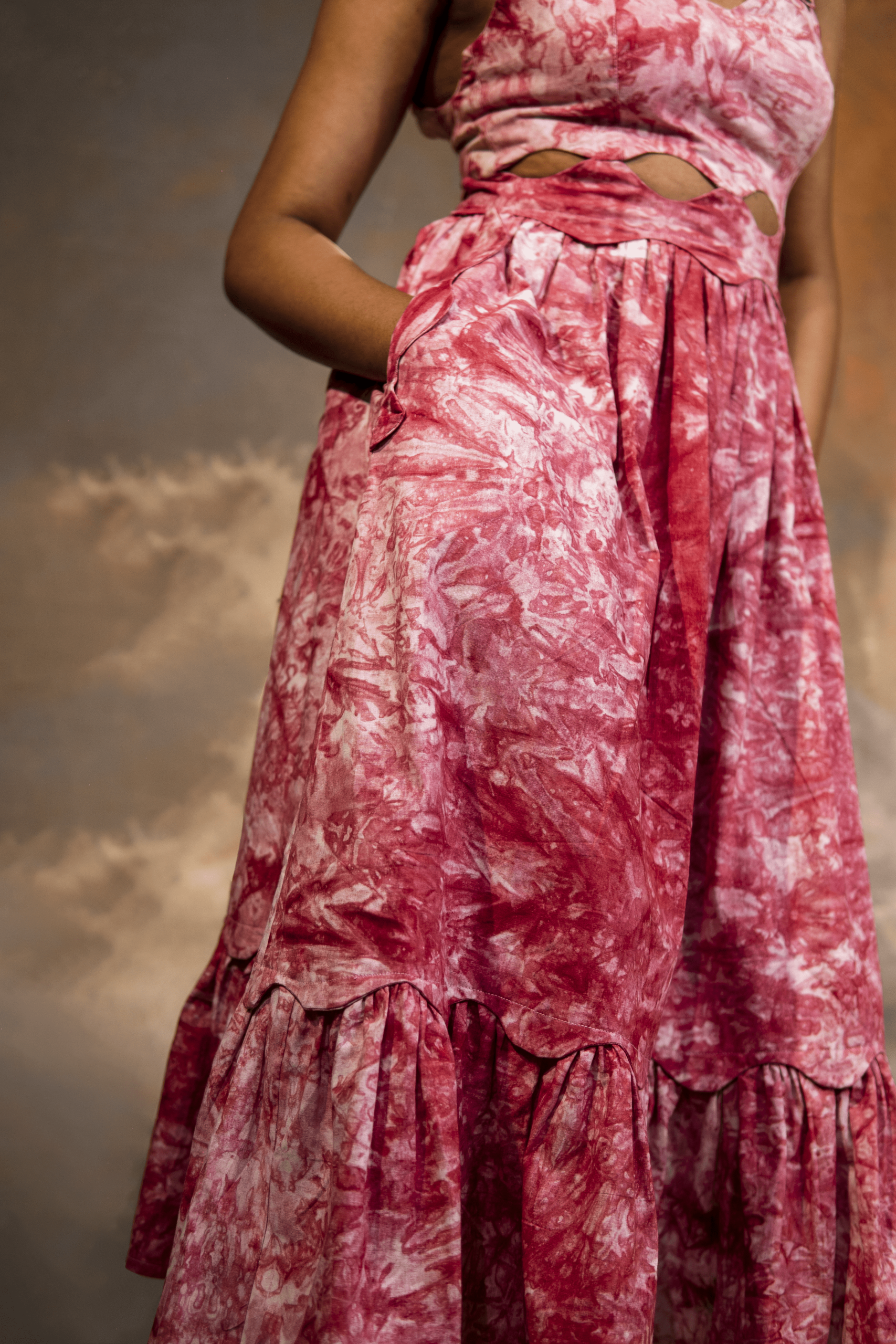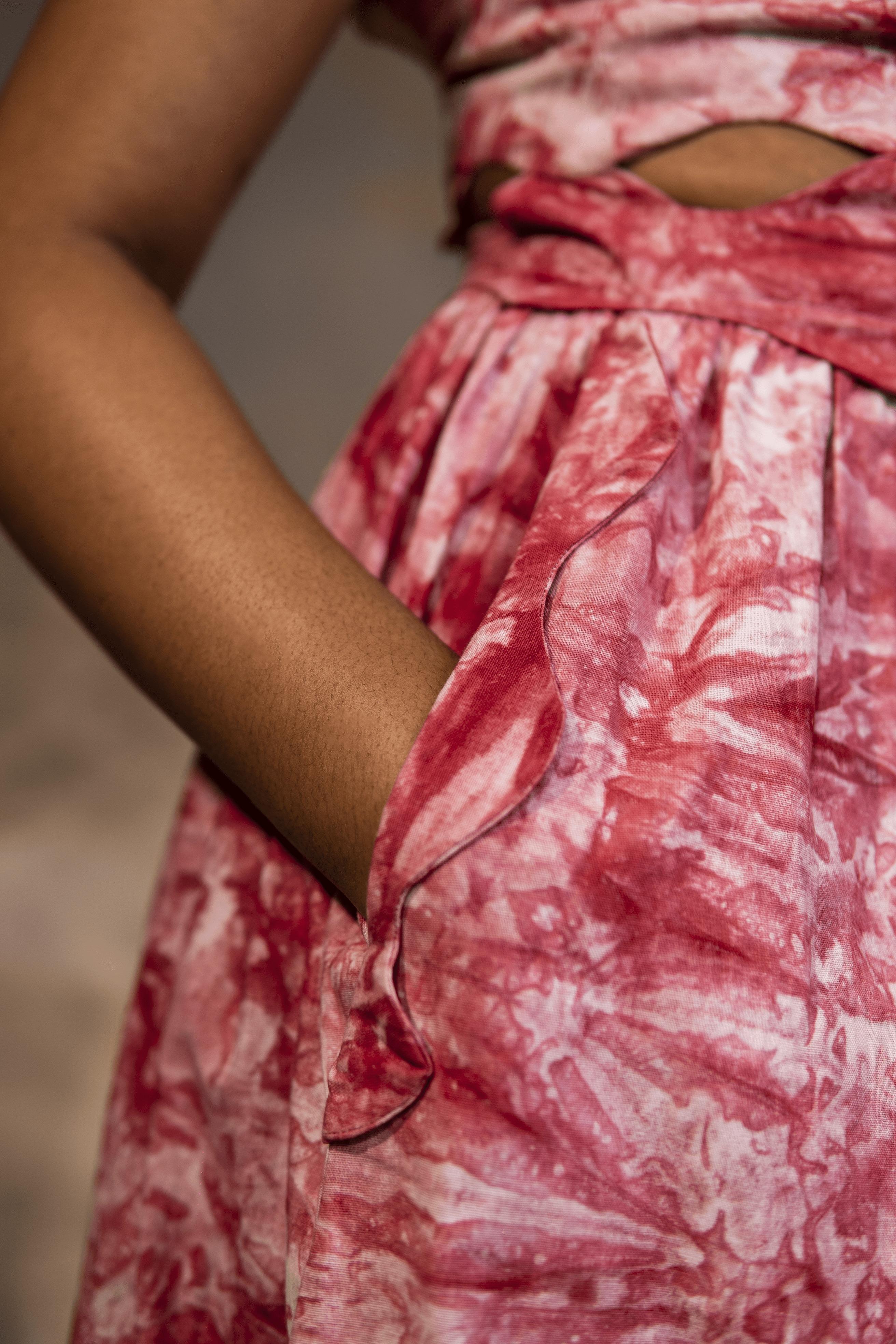 The VA-DAZZLE Dress is a pink Adire dress, featuring a diamond cut out shaped shoulder, strapped with buttons. It features a fitted bodice with diamond shaped cut out at the waist region, giving it a definite structured look,  it also has a zip at the back of the dress and deep side pockets. The dress flares out into a full flowing A-line with pleats giving it volume.