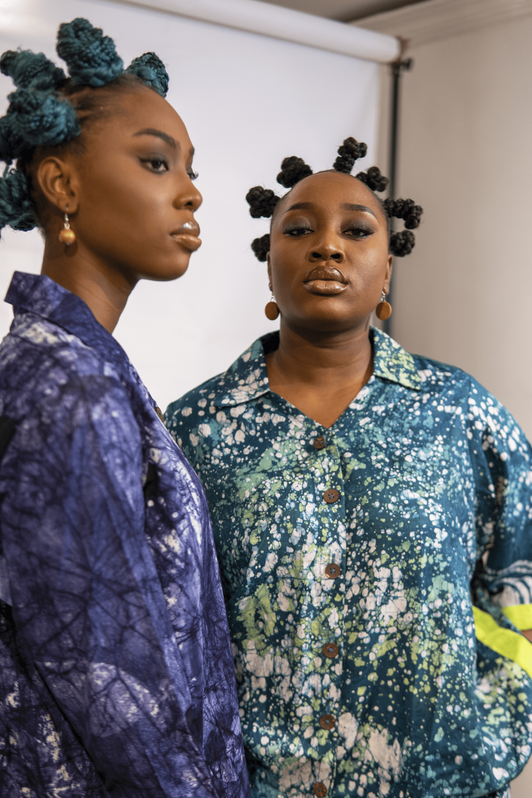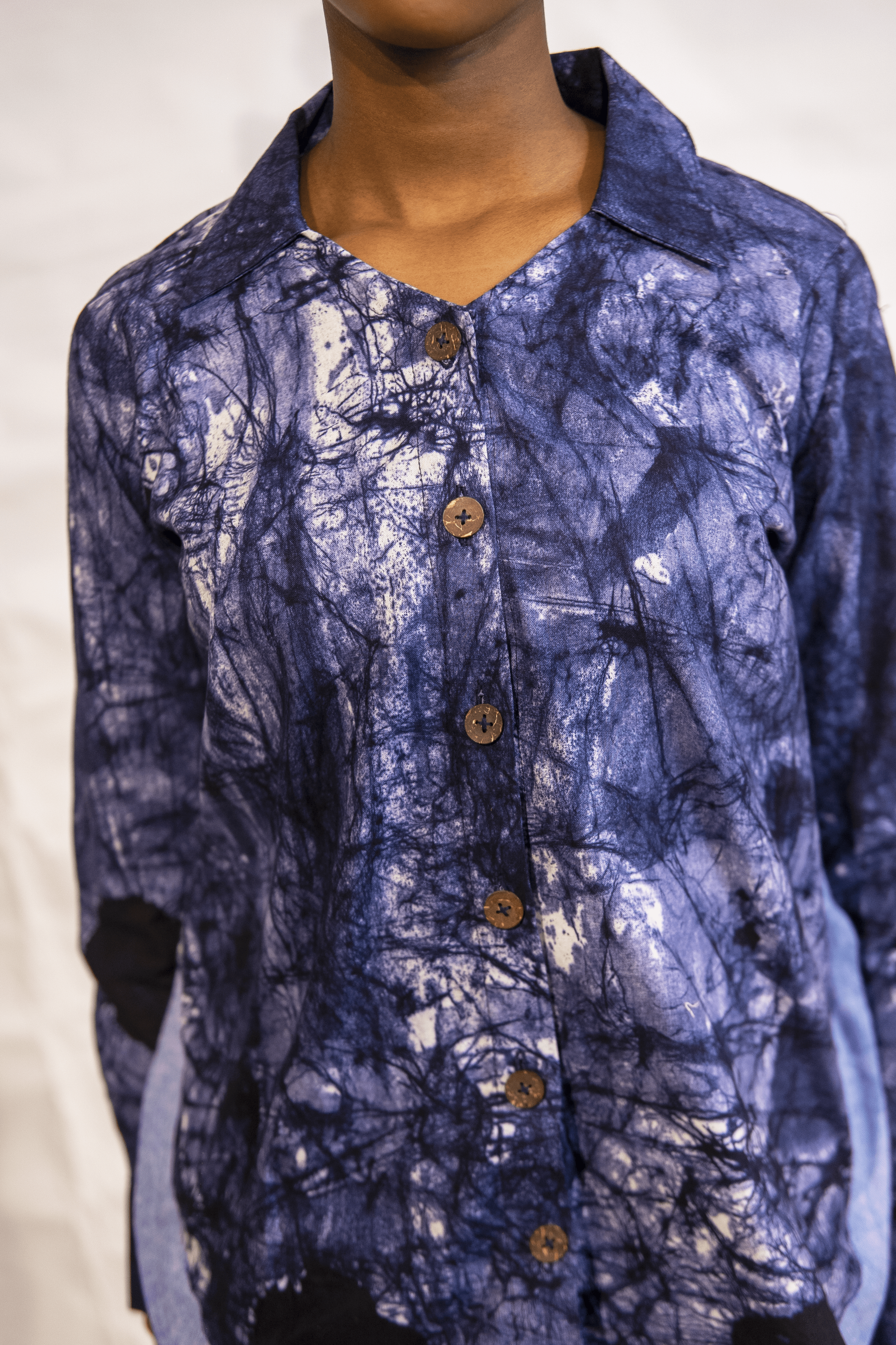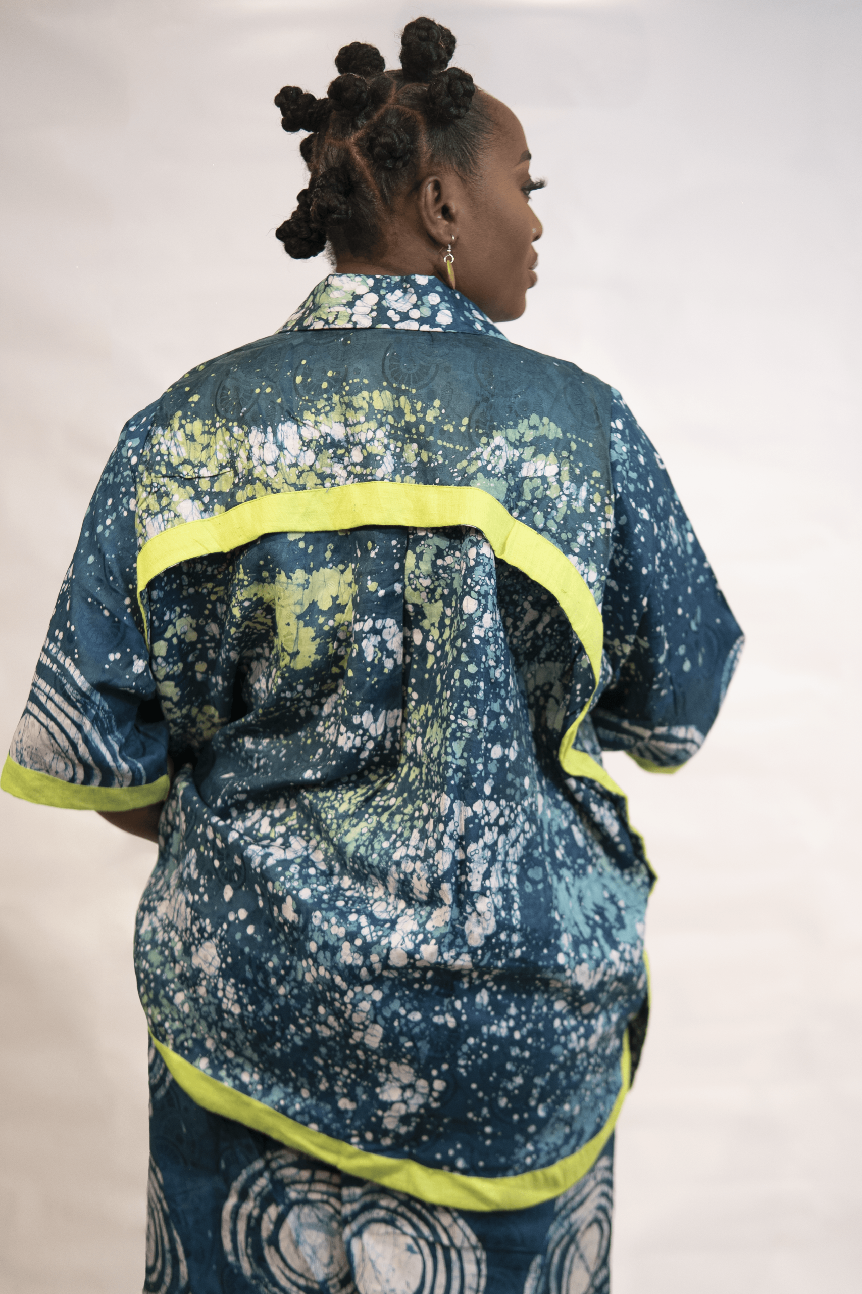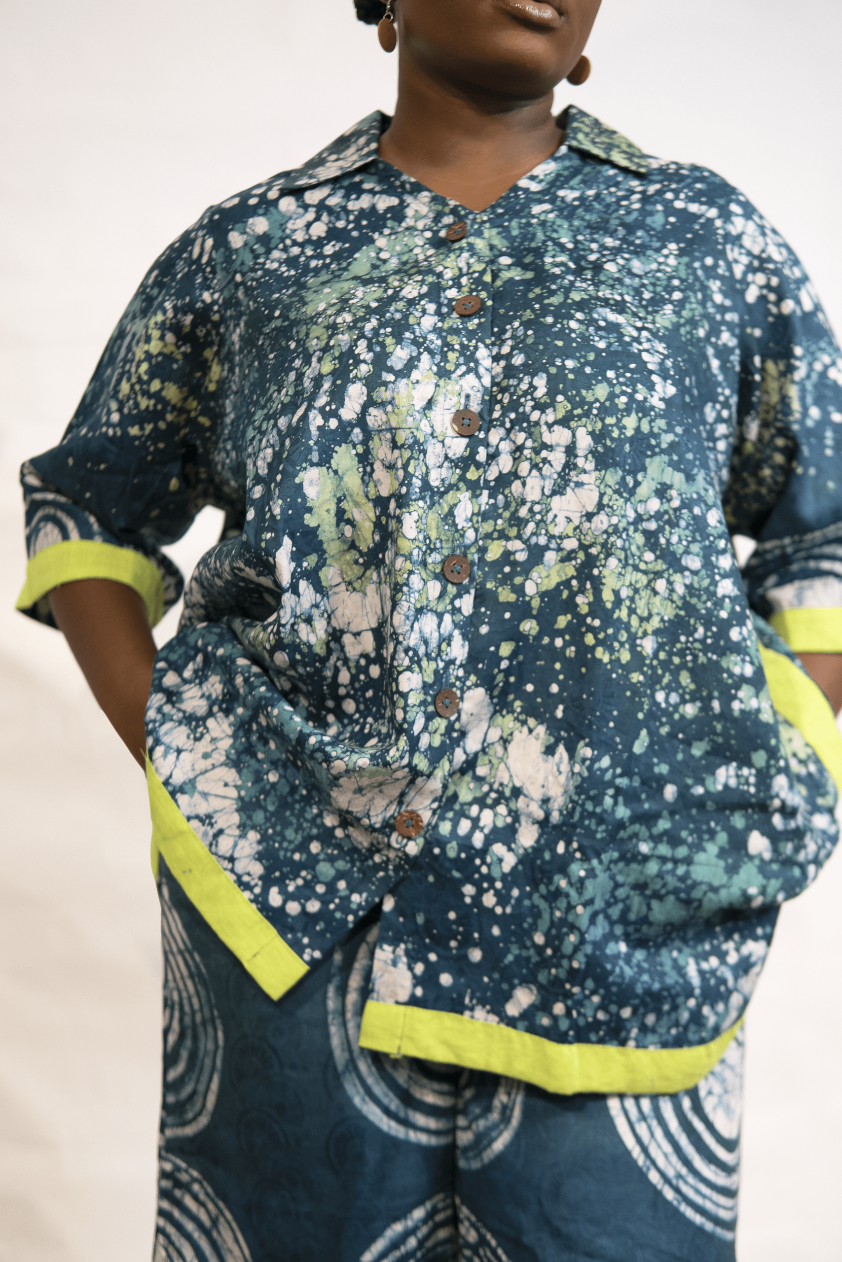The VA Harmony Set is a chic adire two-piece with linen details, featuring a relaxed button-down shirt and wide-leg pants with deep pockets. A perfect blend of comfort, style, and elegance.