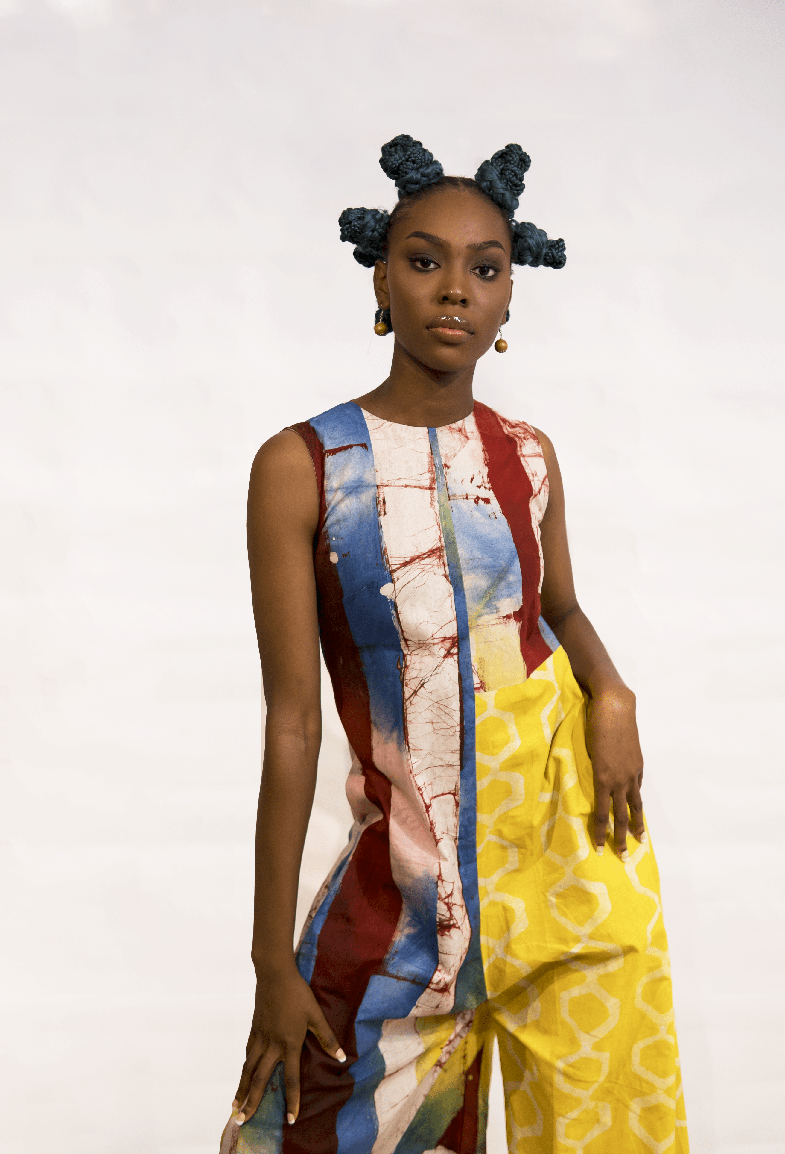 The VA-ICON Jumpsuit is a statement Adire  designed to turn heads with its unique blend of style and comfort. It features a sleeveless, high-neck cut with a back zipper for ease of wear. The half-and-half pattern highlights two distinct Adire fabrics, creating a bold contrast. With its wide-leg silhouette and deep side pockets for stile and comfort.
