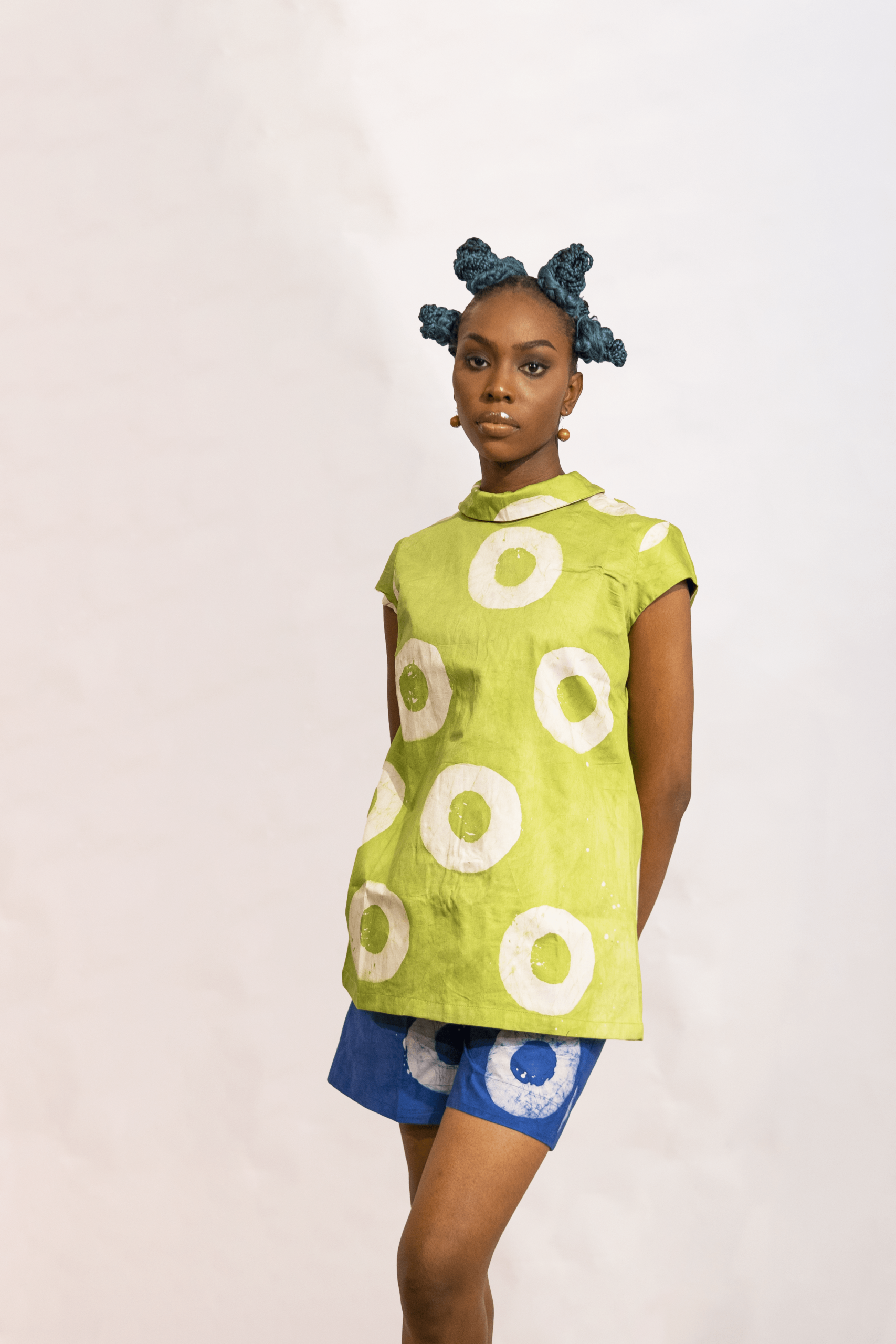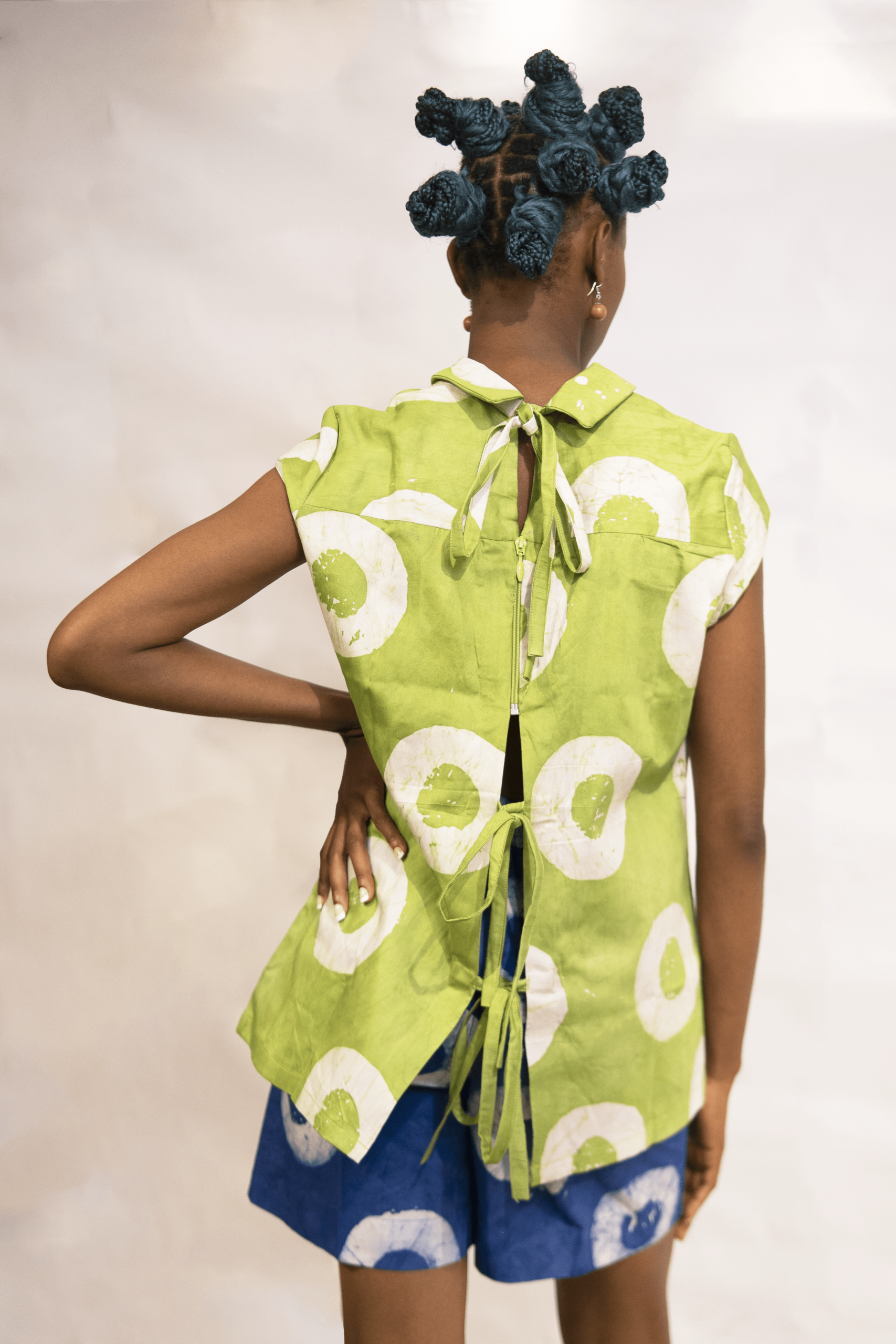 The VA IMURA Set is a two-piece outfit made with adire fabric, designed to be both stylish and comfortable. The top features a classic round neckline and short sleeves, with a unique tie-and-zip detail at the back that makes it adjustable. The set comes with short and deep side pockets. This set is perfect for casual outings, giving off a fun, vibrant, and effortlessly chic vibe.