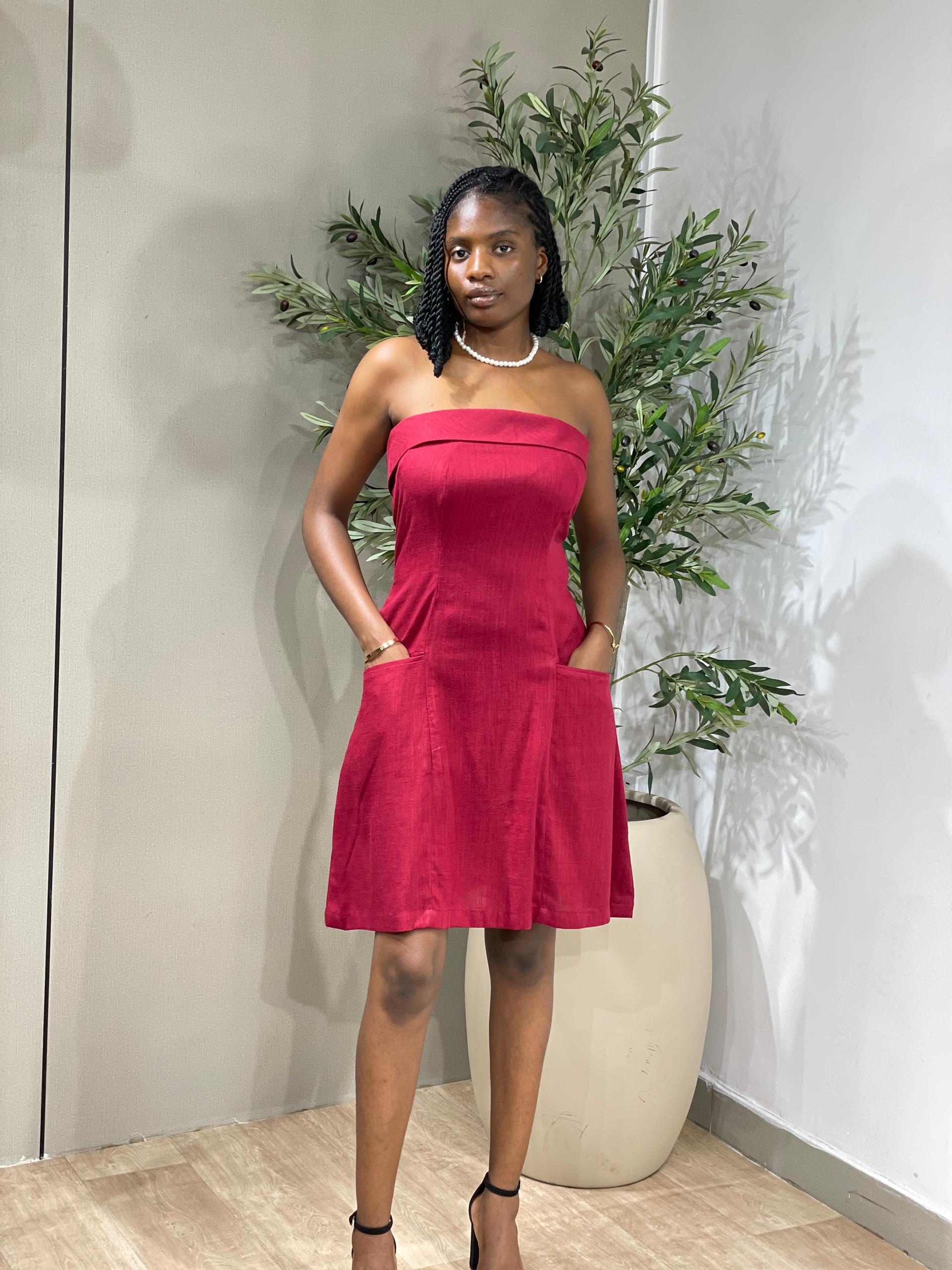 The VA Mabel Dress is a two-piece linen set featuring a tube midi dress with pockets and zipper, paired with a chic cropped jacket for a stylish look.