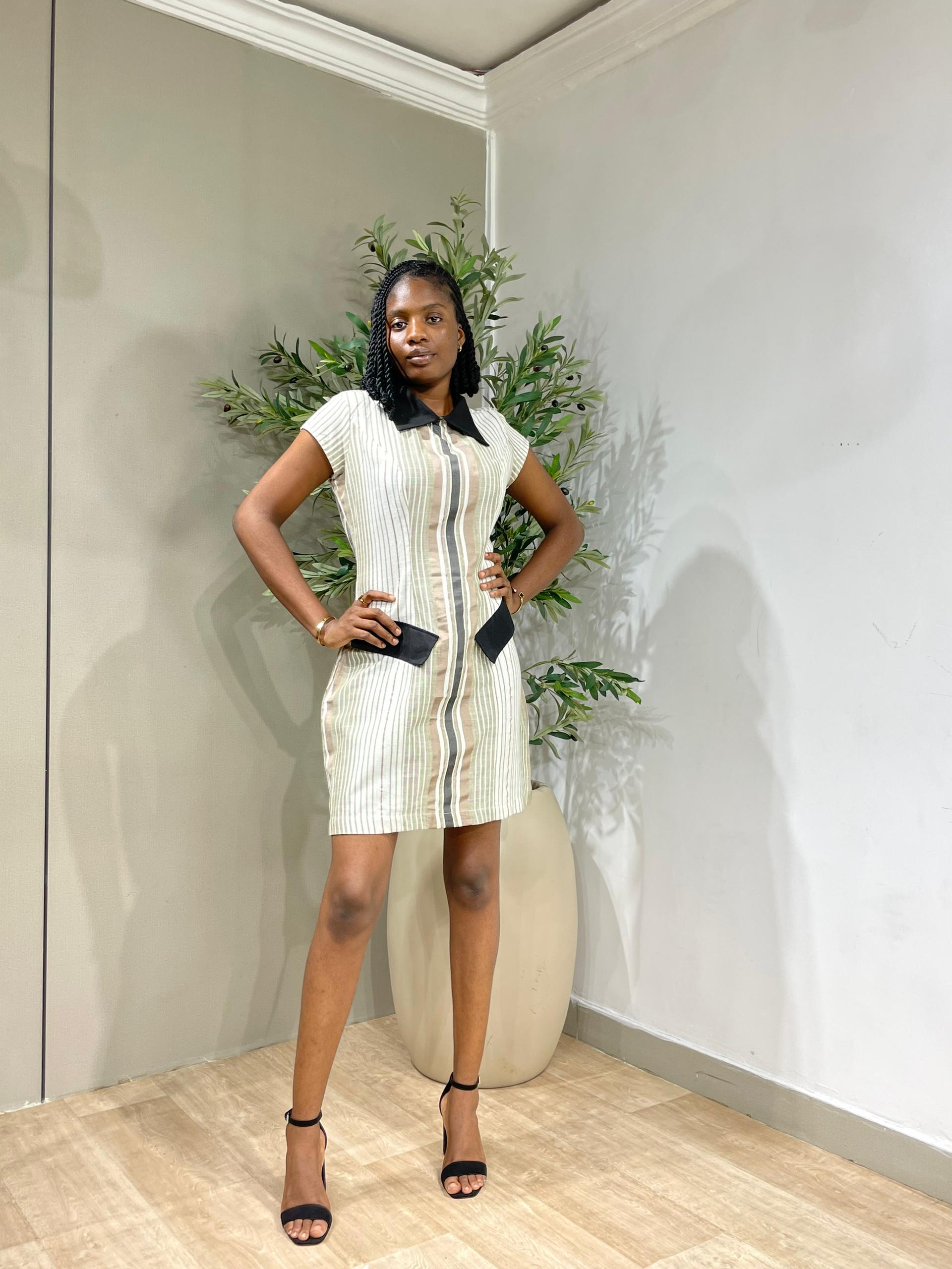 The VA-MIRA Dress is a straight-cut midi dress designed with a smart collar neckline and two decorative false pockets for a sleek, modern look.