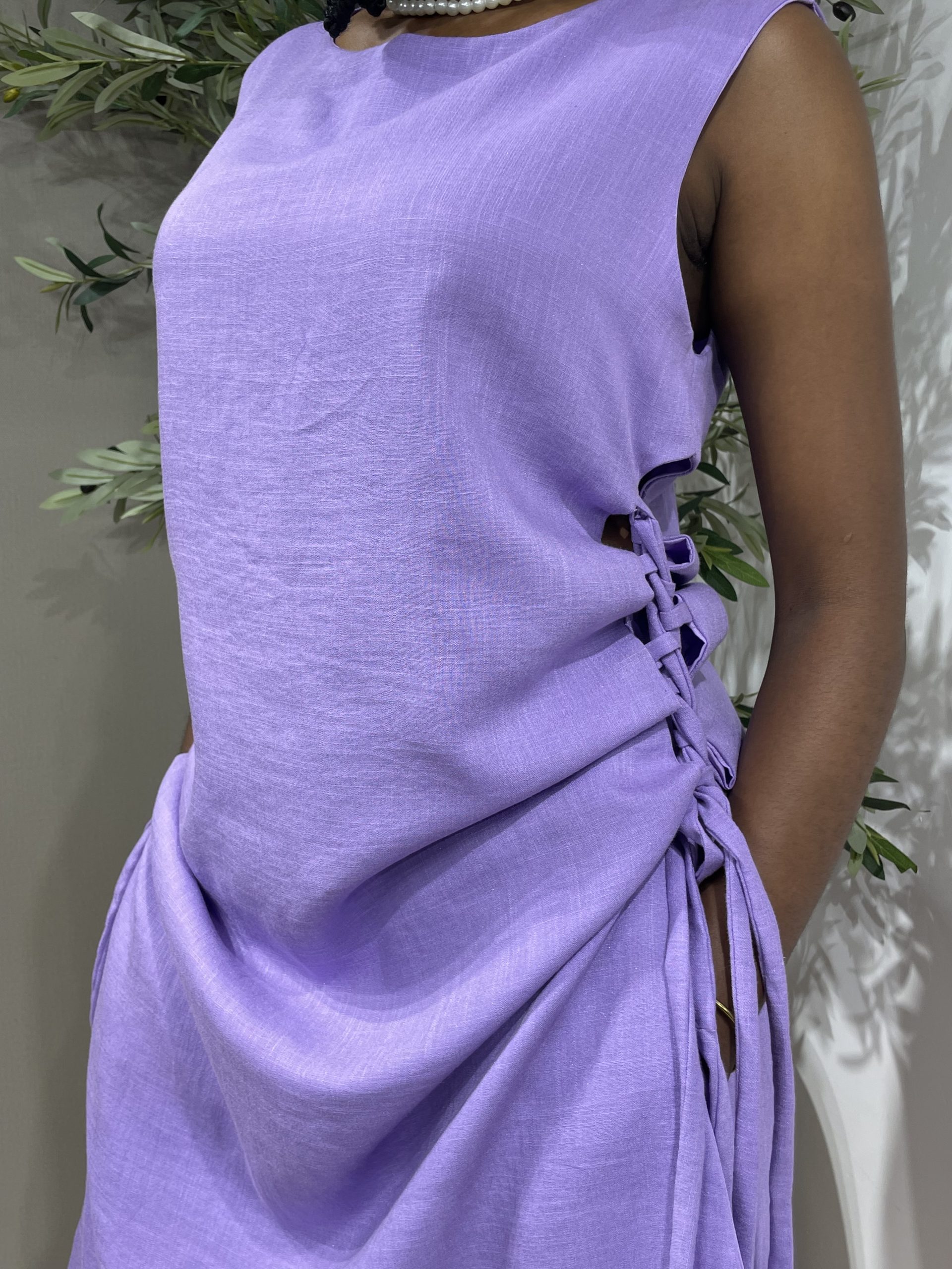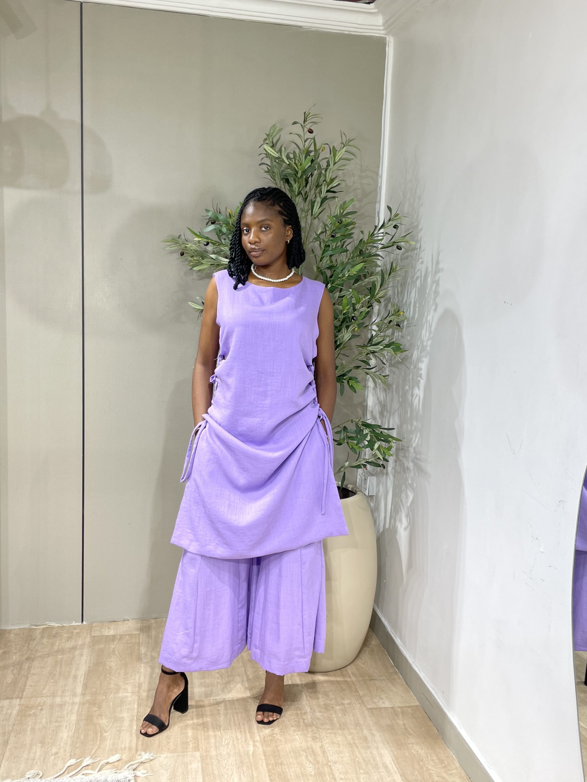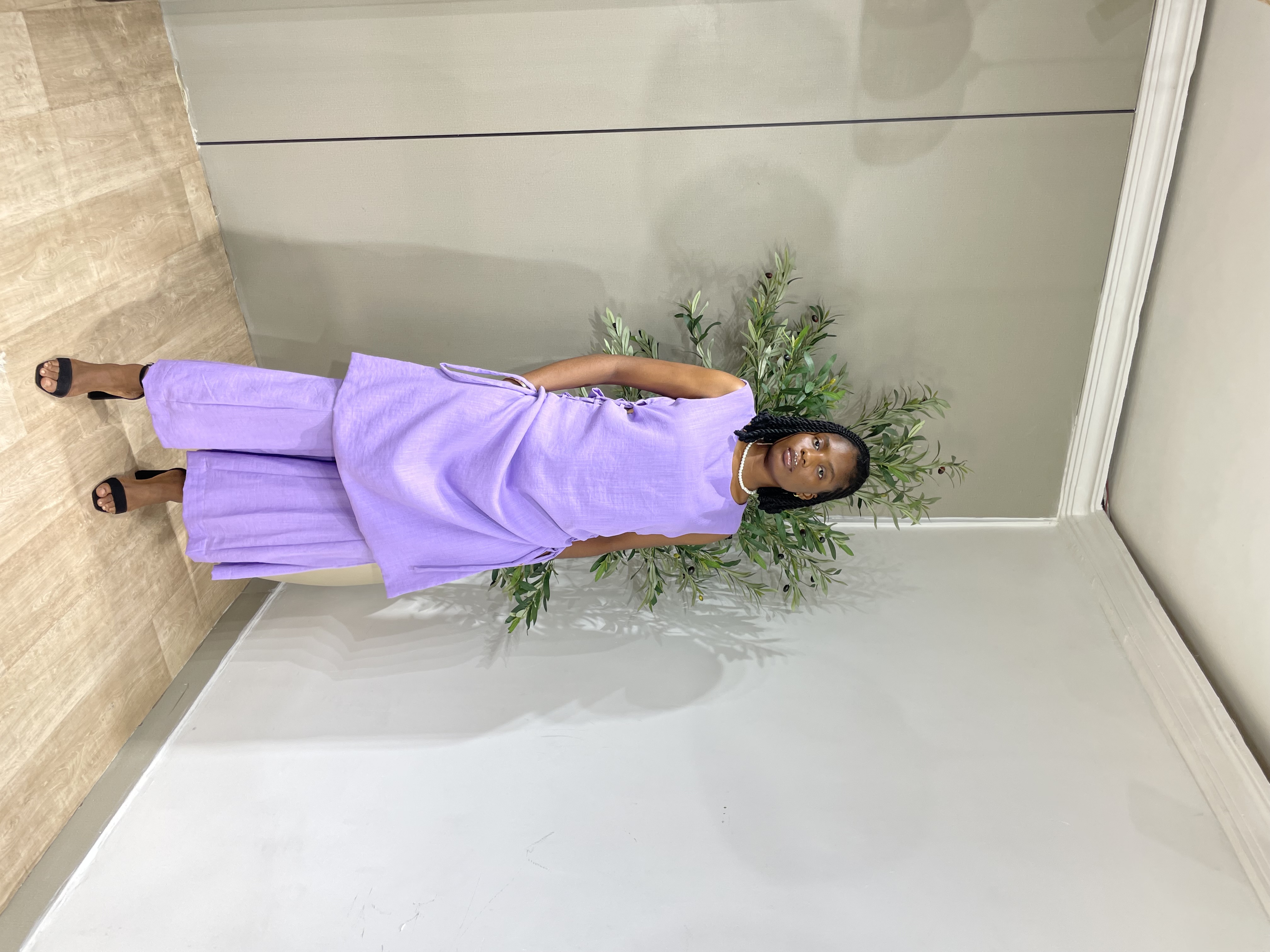 The Pearl Set is breezy and comfortable linen set, featuring a midi-length free size top with adjustable drawstring sides and flowy maxi wide-leg pants with an pockets and an elastic waistband for ease of wearing.