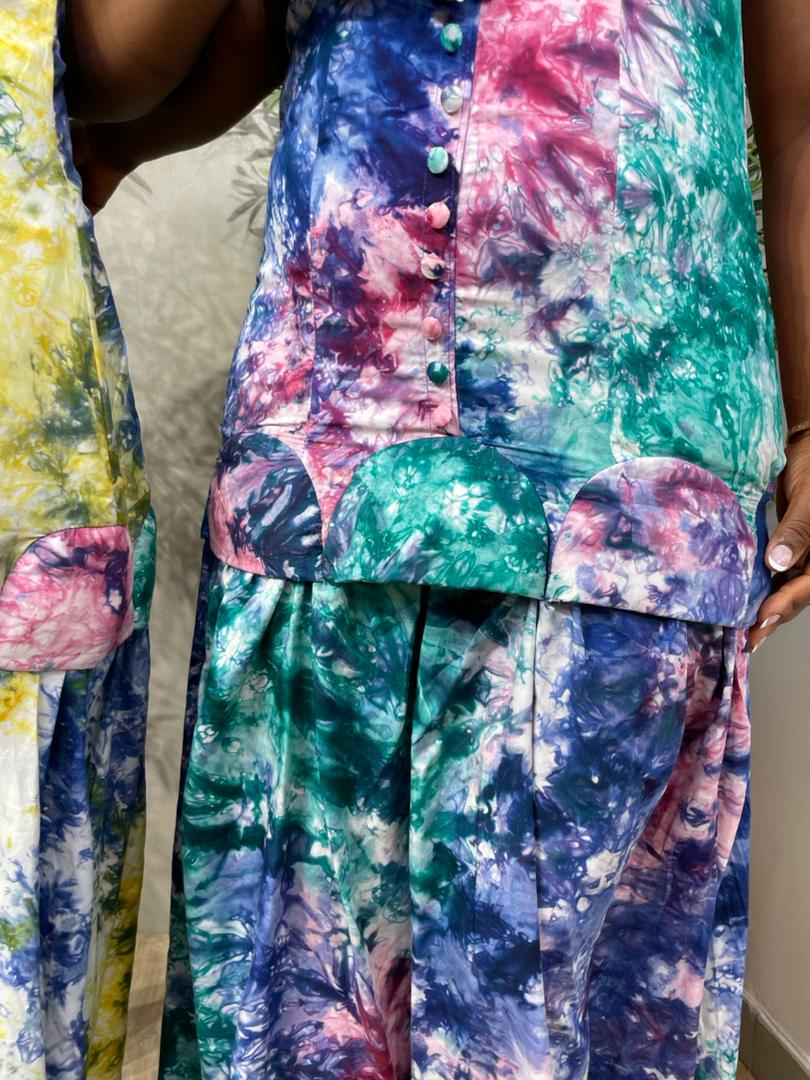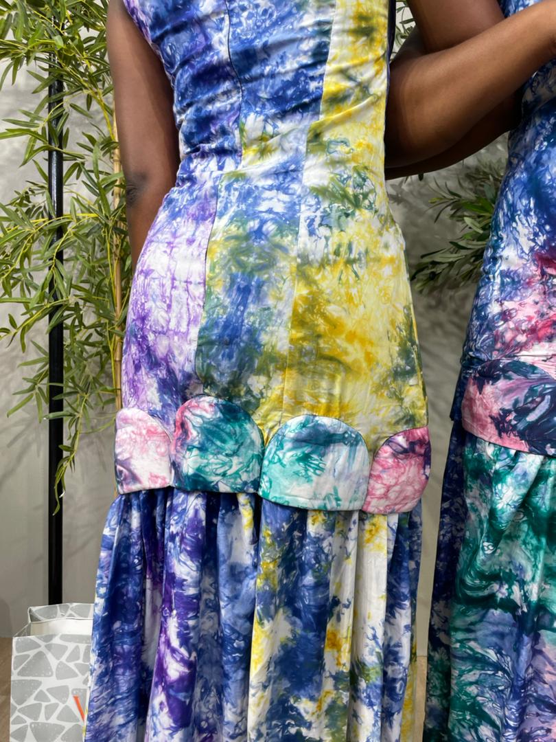 The VA-RAINBOW Dress is a multi-colored structured sleeveless bodice dress, made from Adire crepe. It features a High neckline with a frontal false buttons, and invisible back long zipper for ease of wearing. The dress has an Arc-like structure at the lower part of the, allowing a graceful flow when in motion.